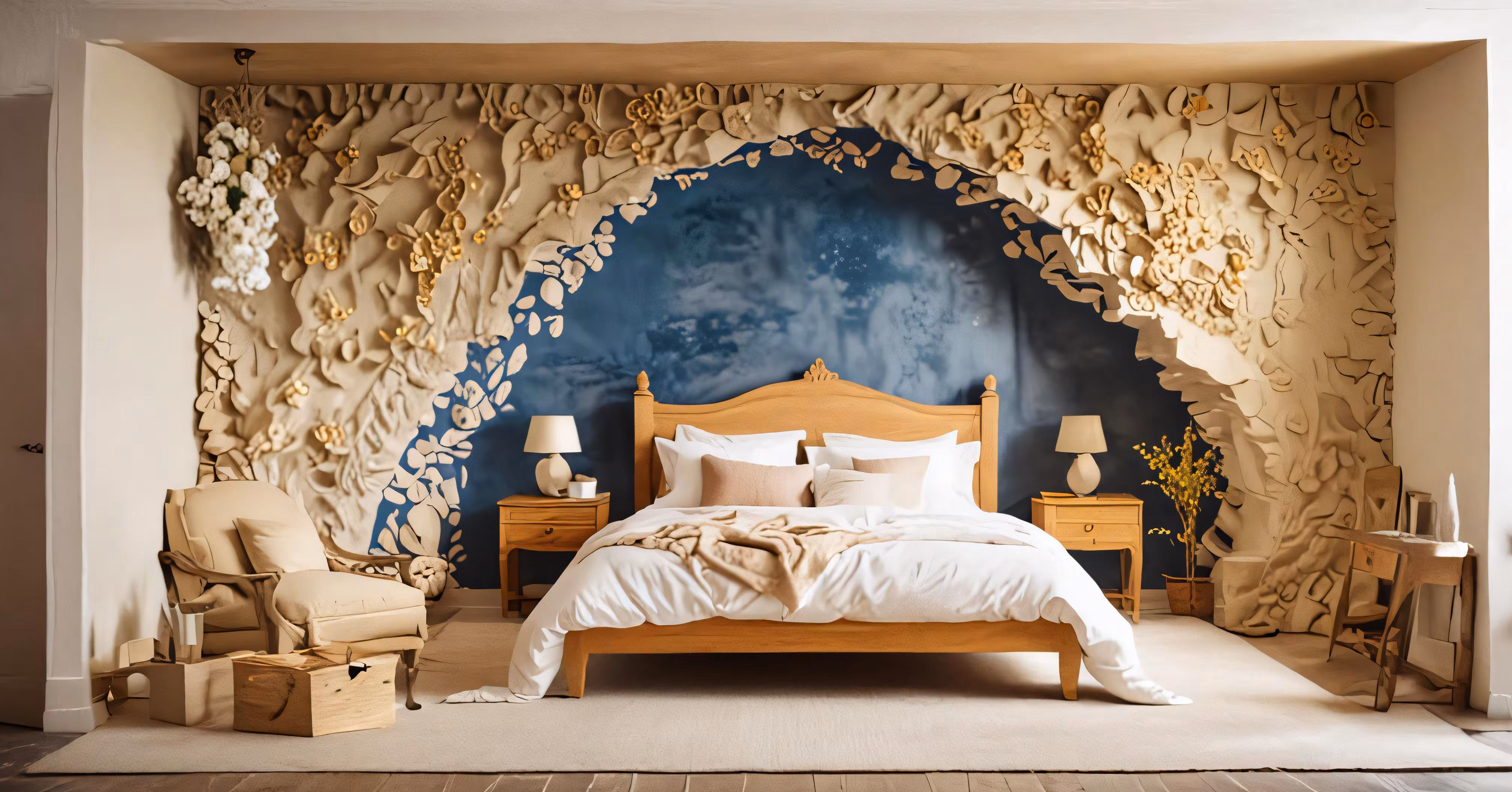 High resolution picture, free to use, the large bed has a large blue wall paper behind it