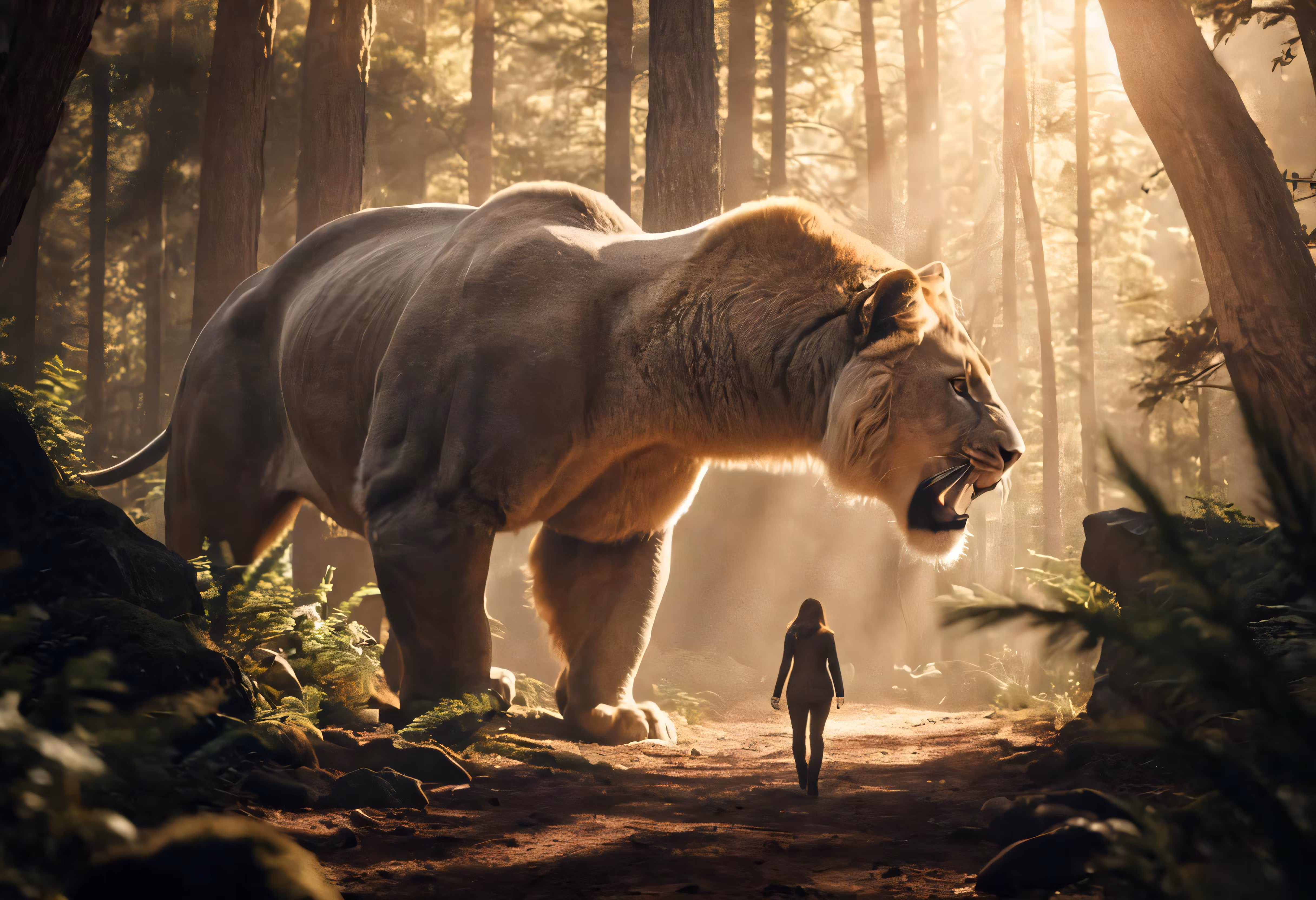 High resolution picture, free to use, the large lion is walking toward the man in the woods