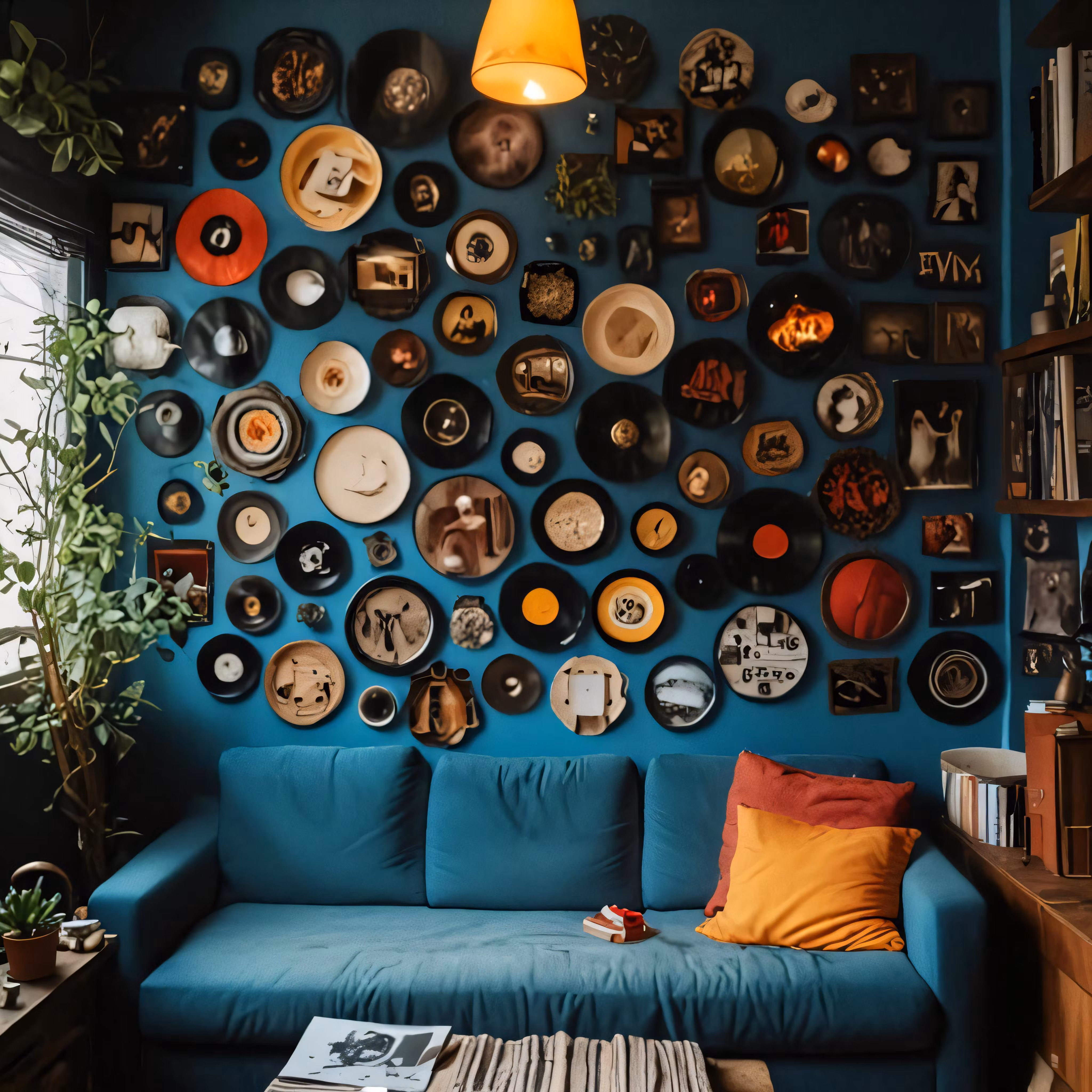 High resolution picture, free to use, the living room is blue with a lot of bowls hanging on the wall