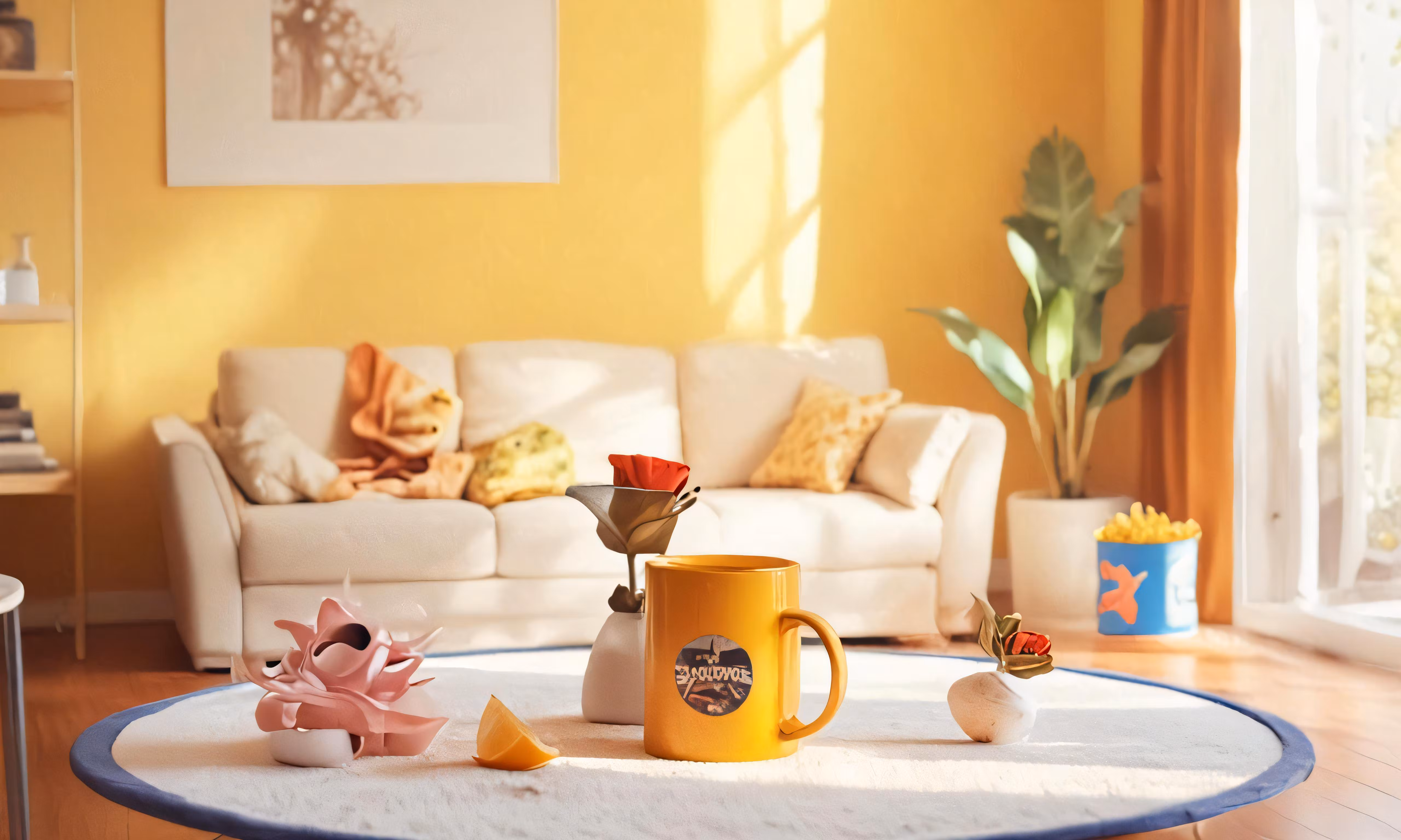 High resolution picture, free to use, the living room is decorated with yellow walls and white furniture