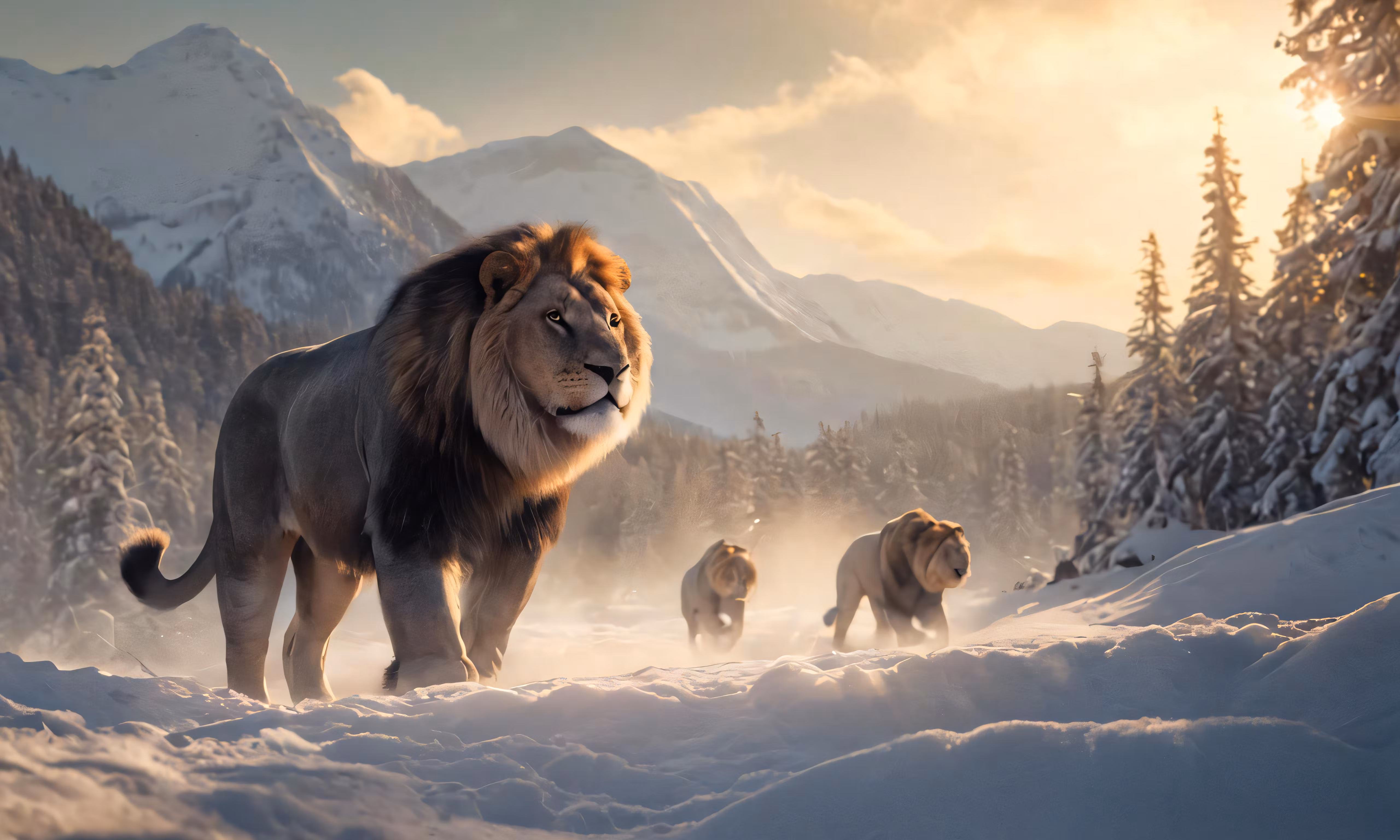 High resolution picture, free to use, the majestic lion is walking through the snow