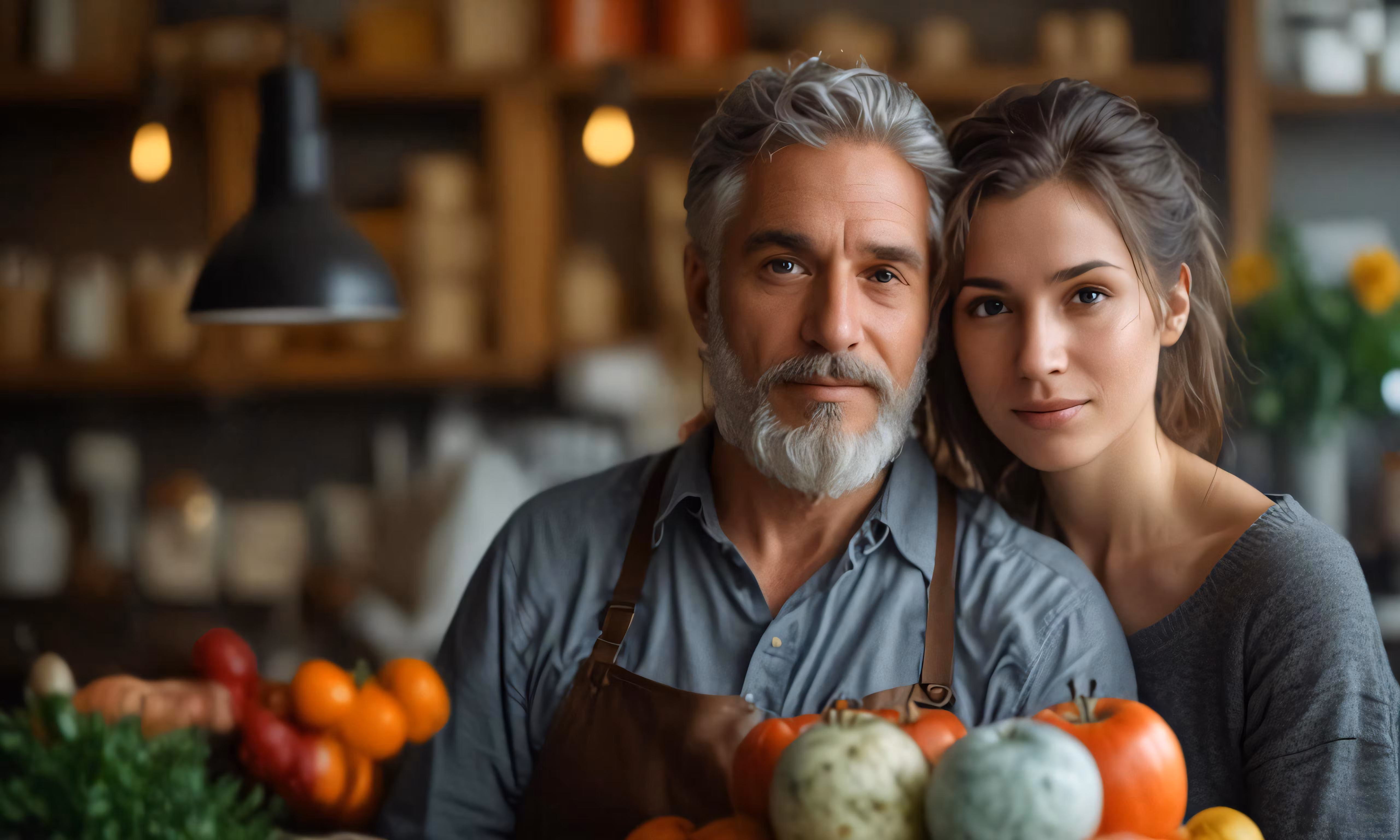 High resolution picture, free to use, the man and woman stand together in front of the fruit