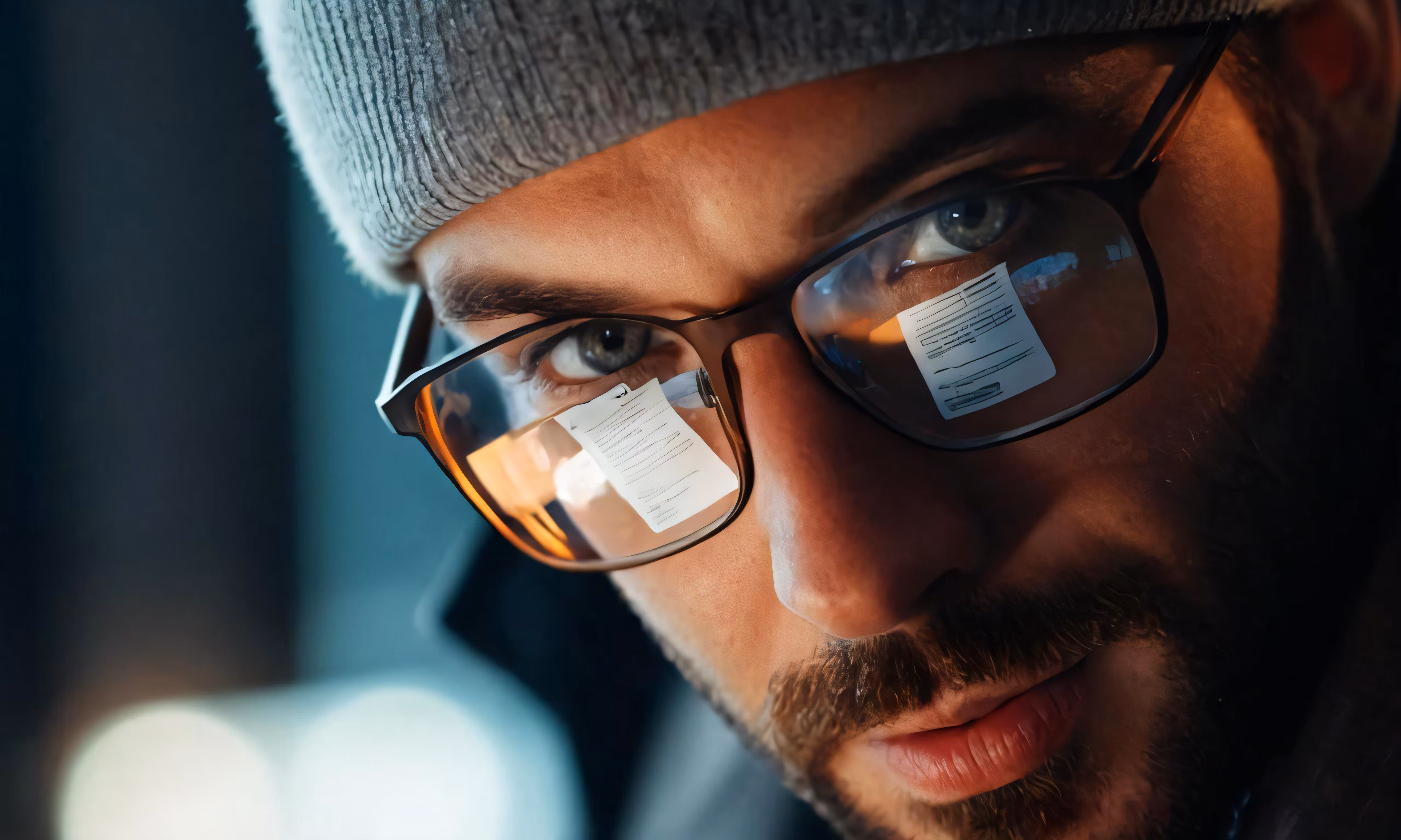 High resolution picture, free to use, the man in glasses has two paper on his forehead