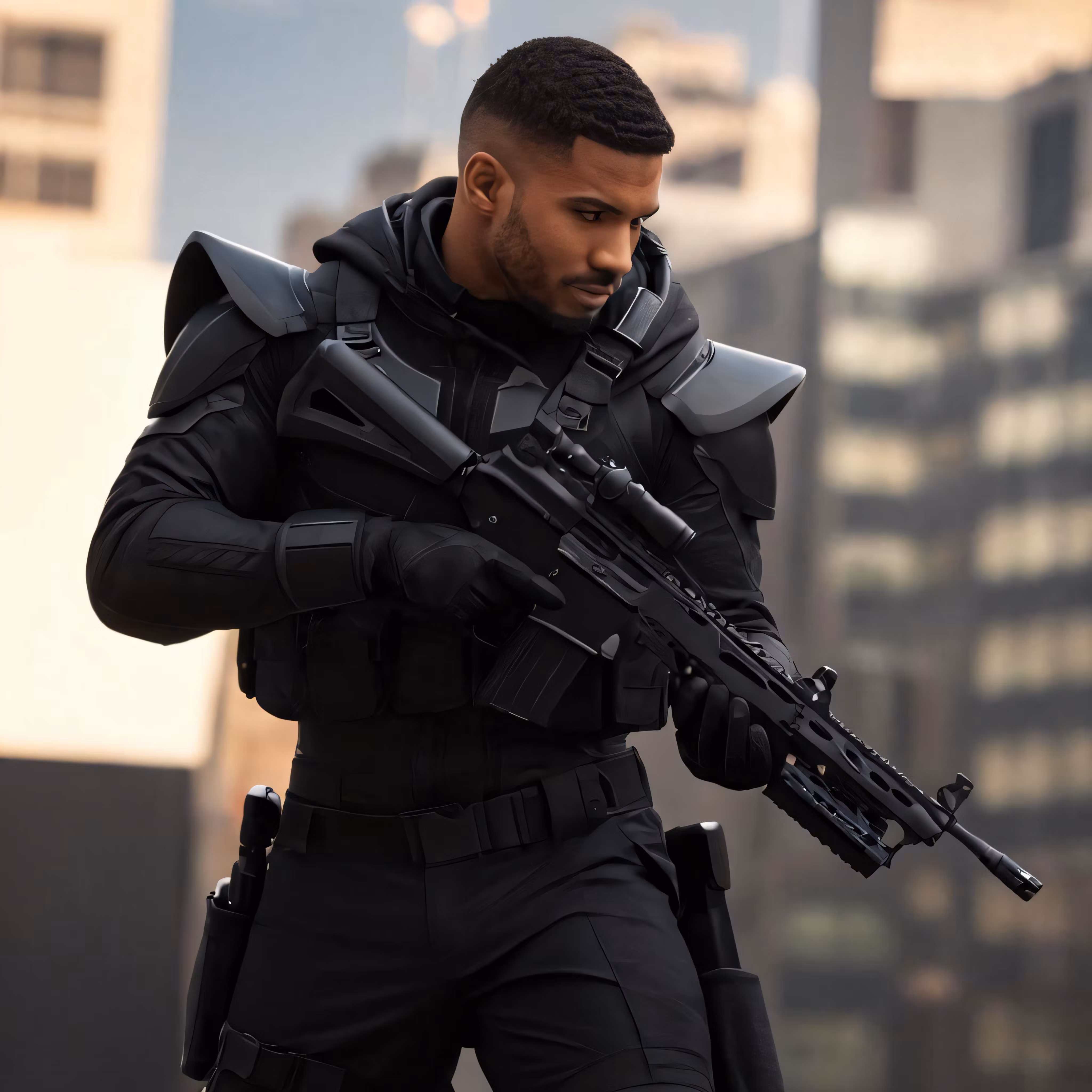 High resolution picture, free to use, the man is holding a gun while wearing black clothes