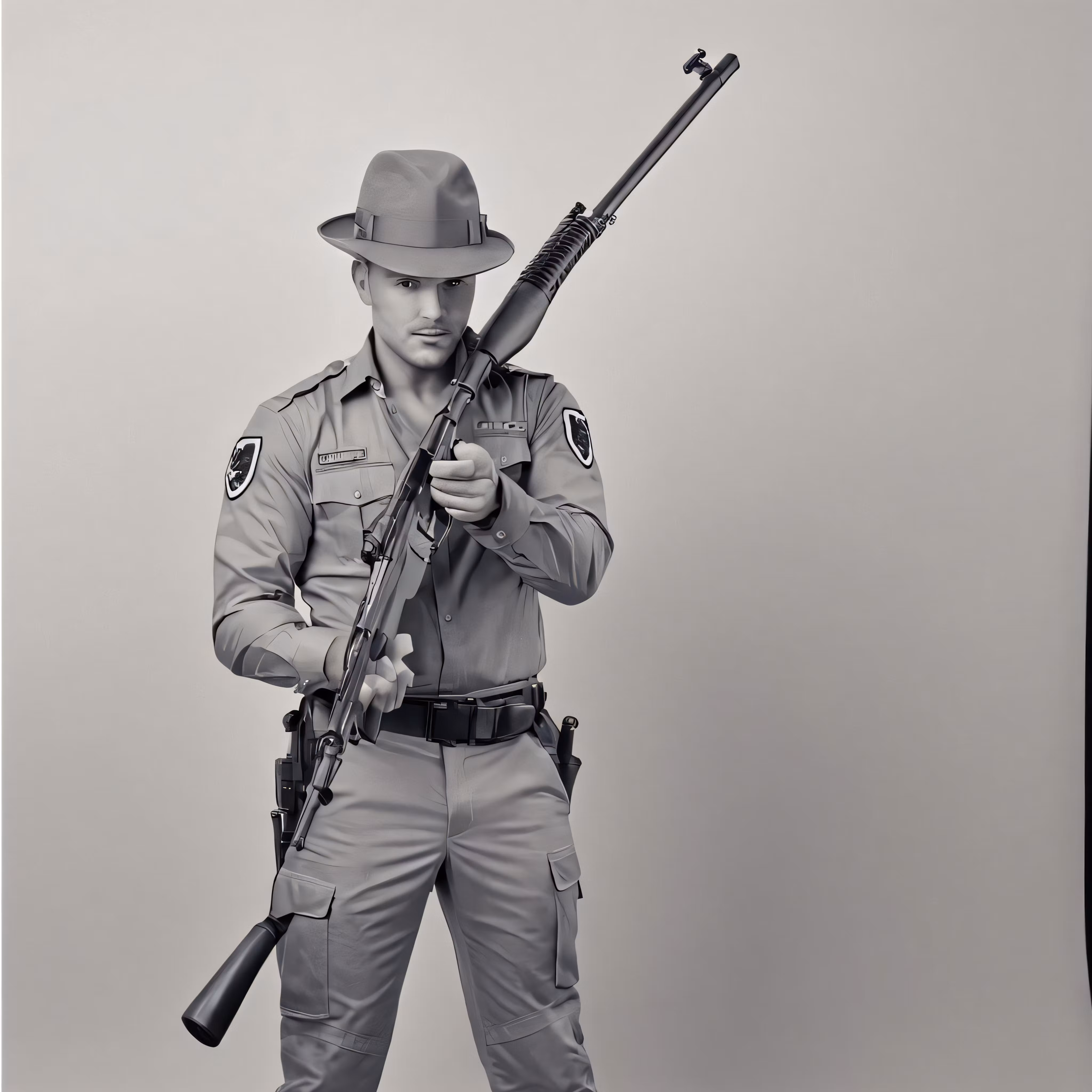 High resolution picture, free to use, the man is holding a rifle and posing for a photo