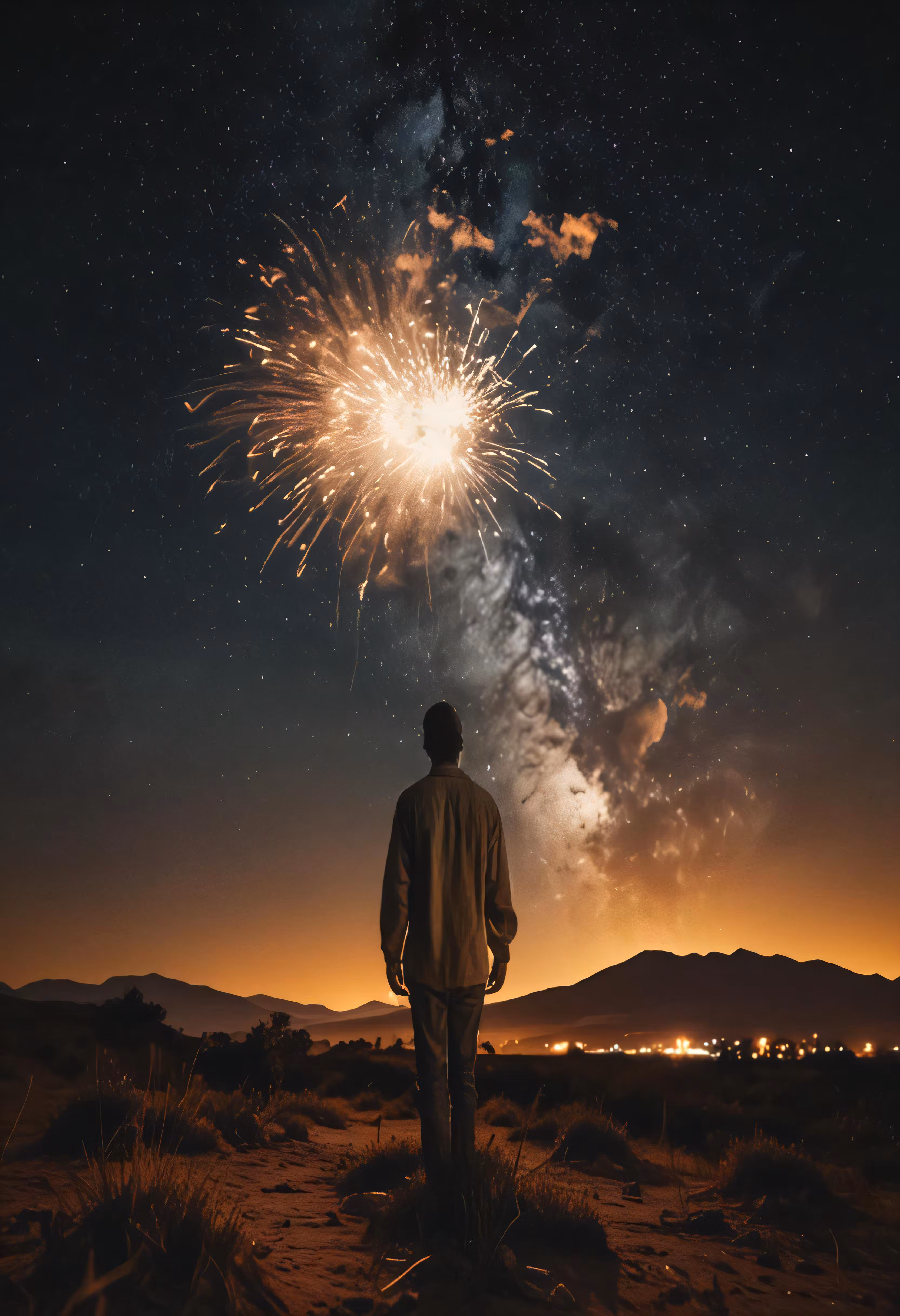High resolution picture, free to use, the man is looking at fireworks that are in the air