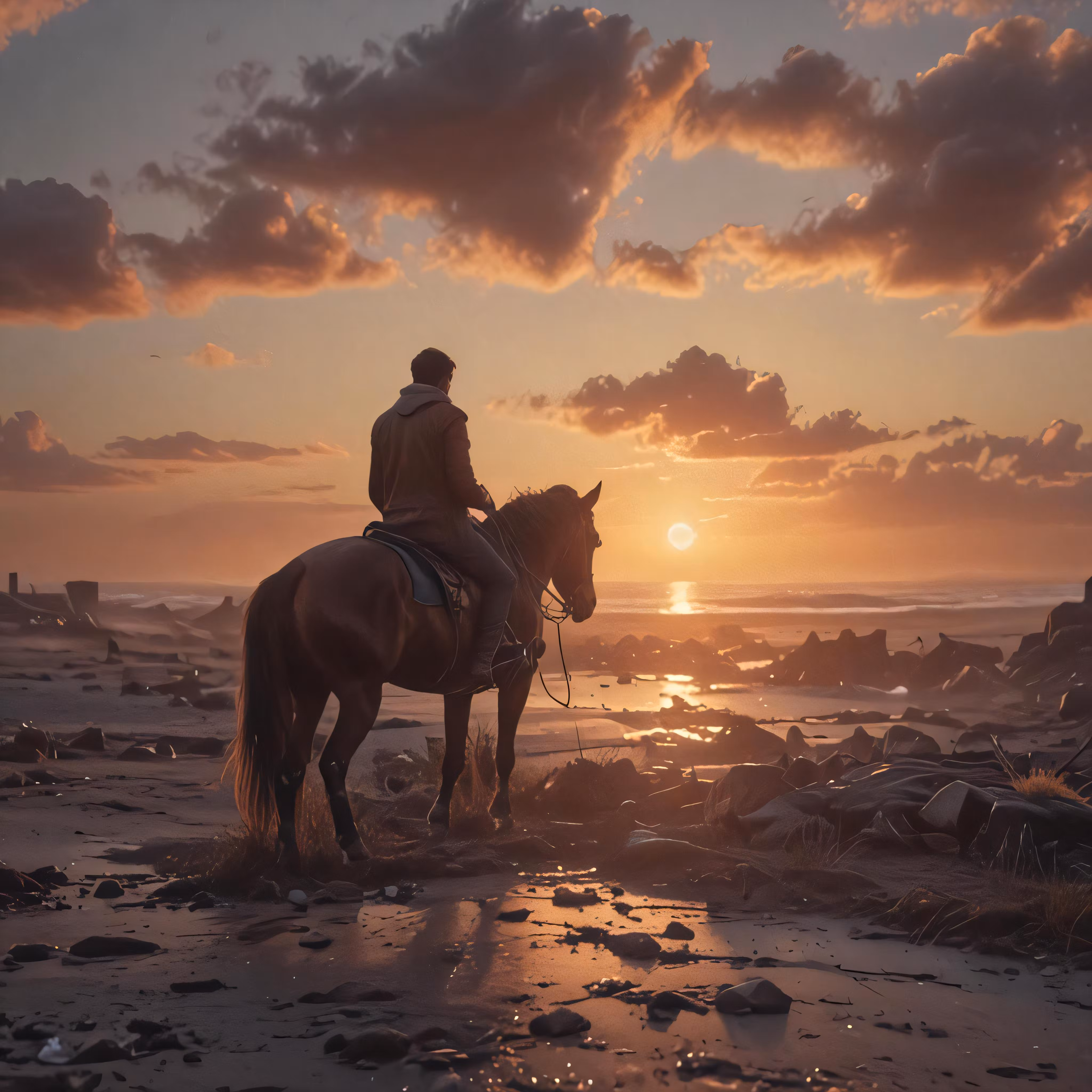 High resolution picture, free to use, the man is riding his horse through the water at sunset