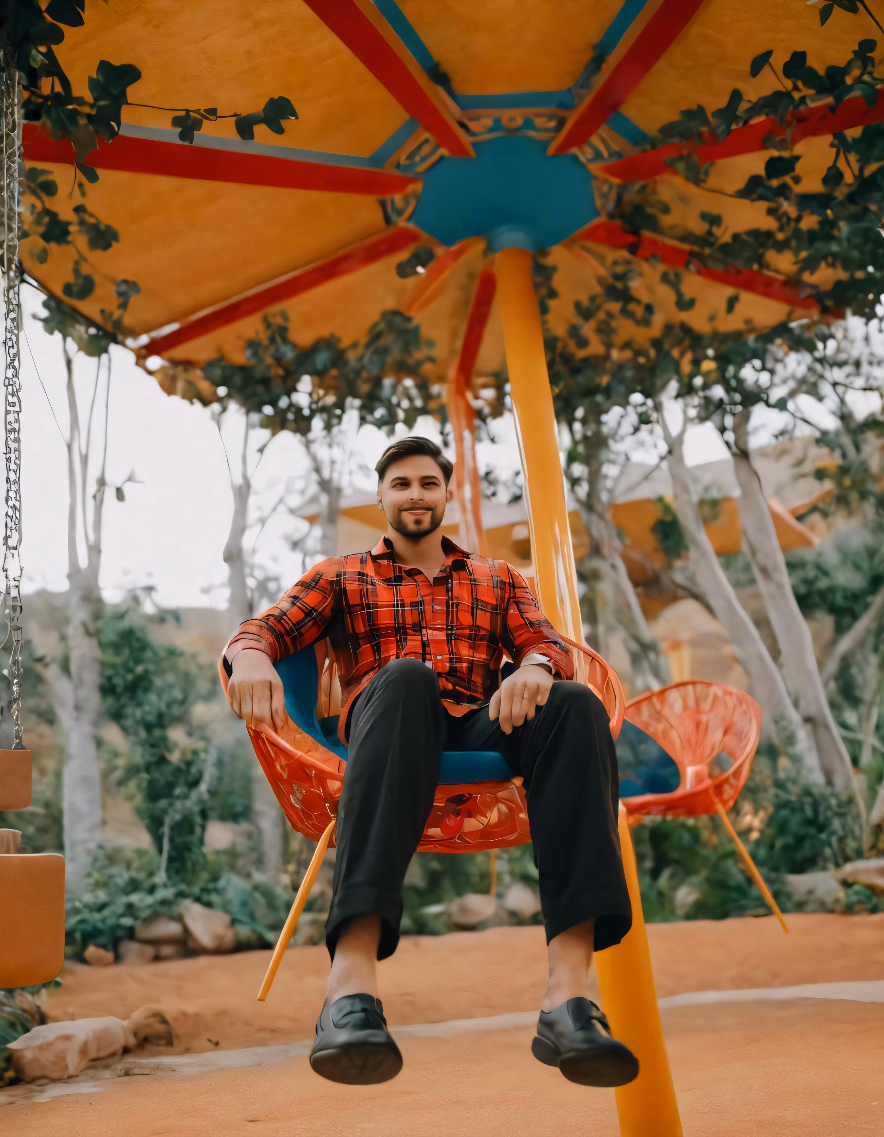 High resolution picture, free to use, the man is sitting on an outside chair under a yellow umbrella