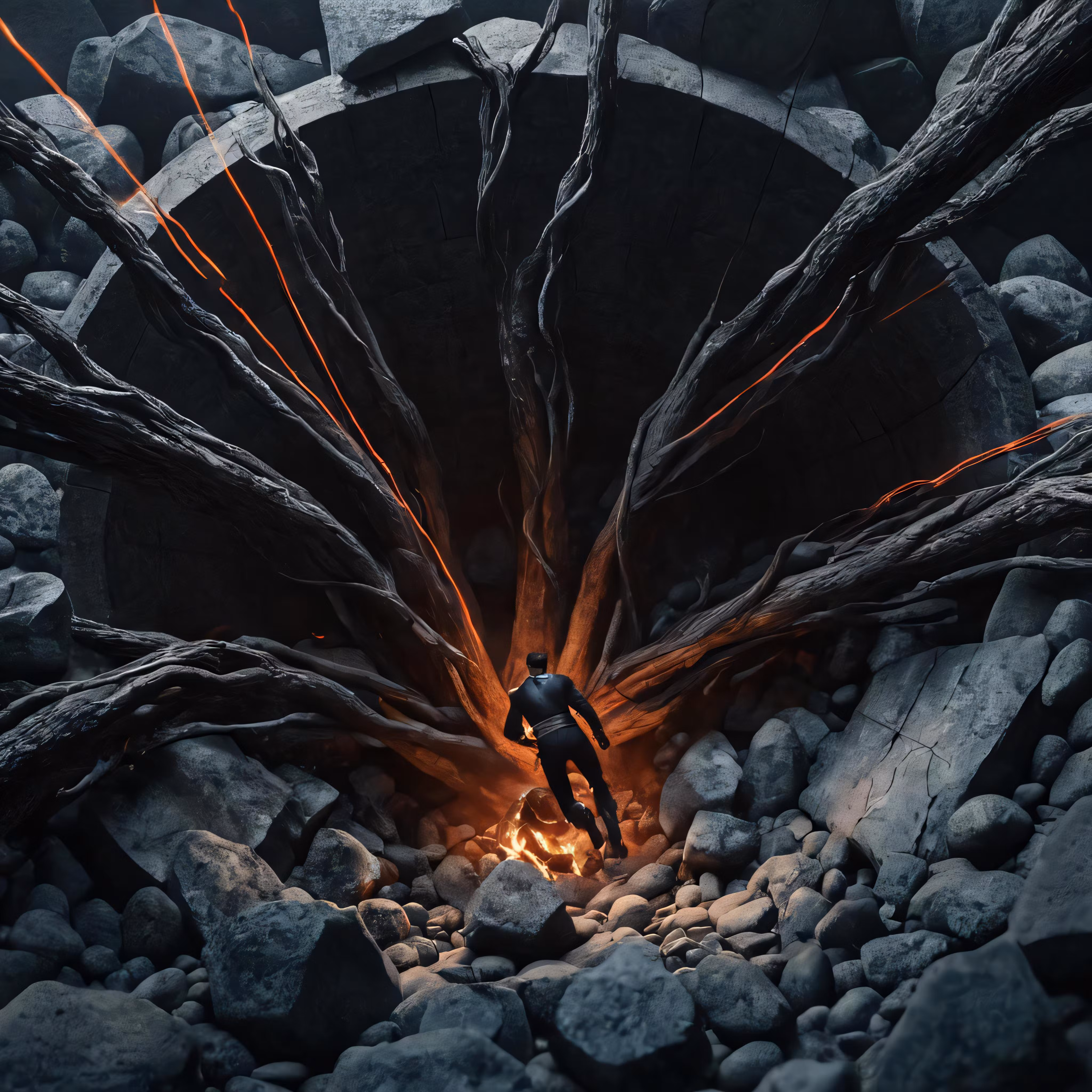 High resolution picture, free to use, the man is standing in a cave next to some fire