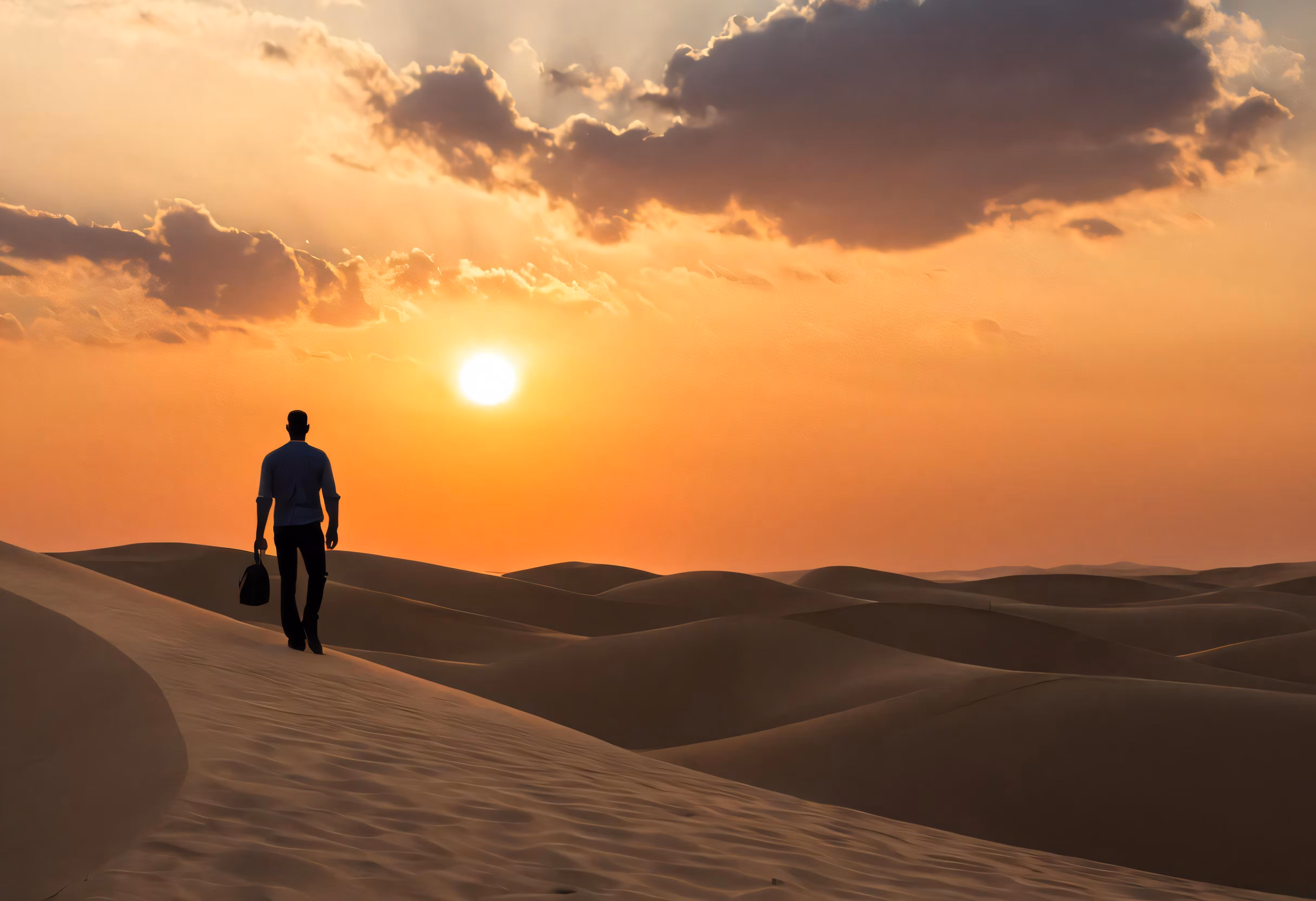 High resolution picture, free to use, the man is walking through the dunes at sunset