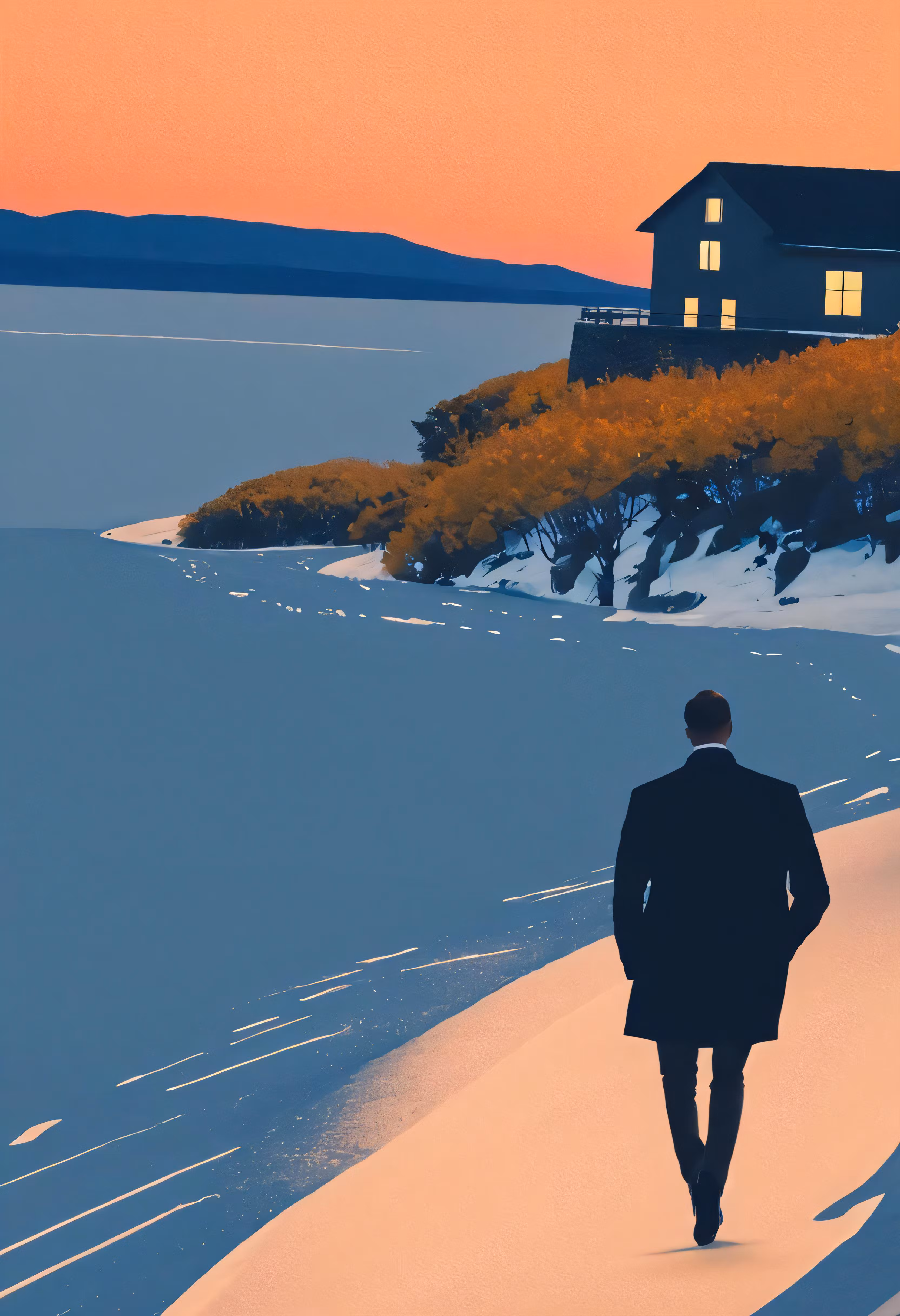 High resolution picture, free to use, the man is walking toward the house at dusk