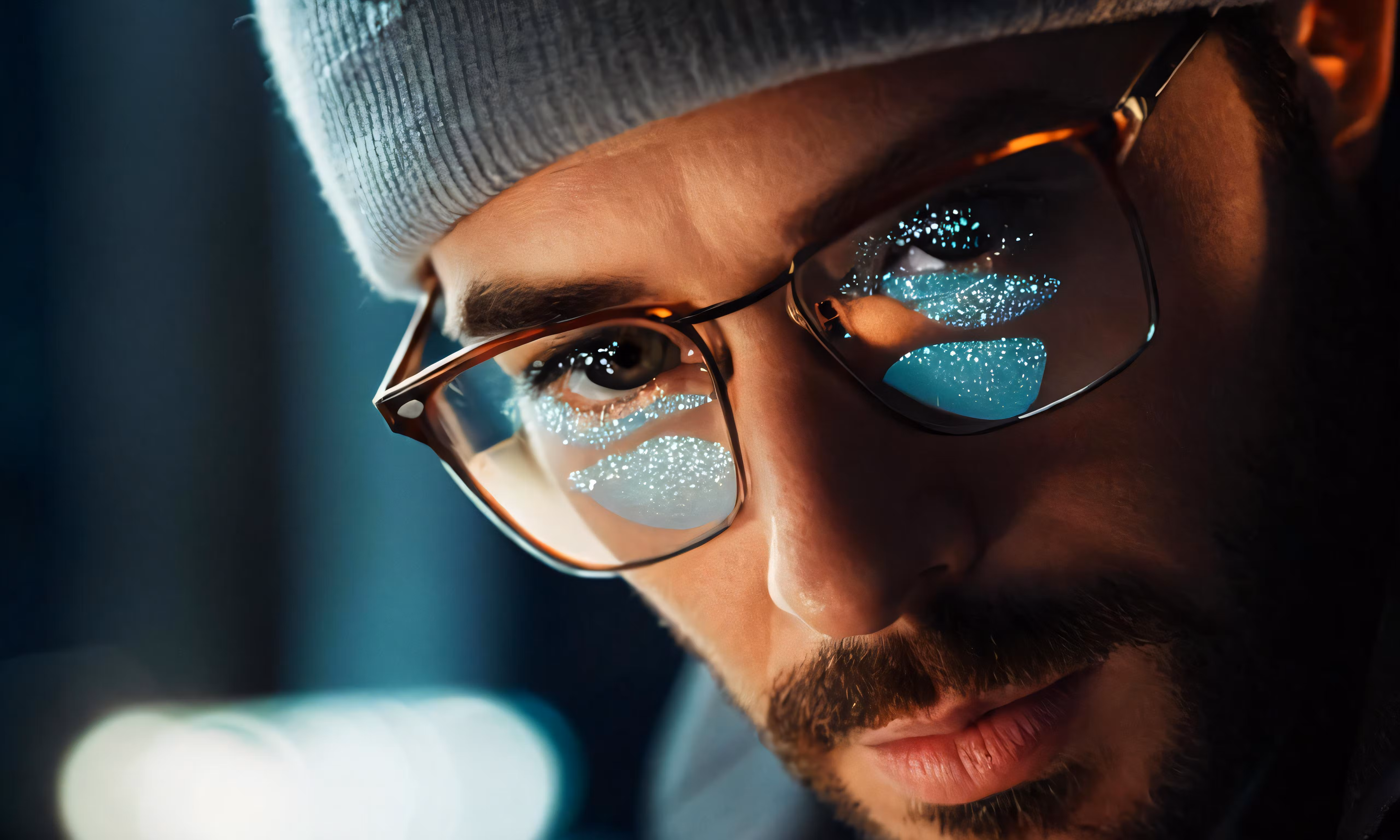 High resolution picture, free to use, the man is wearing a pair of glasses with snow on them
