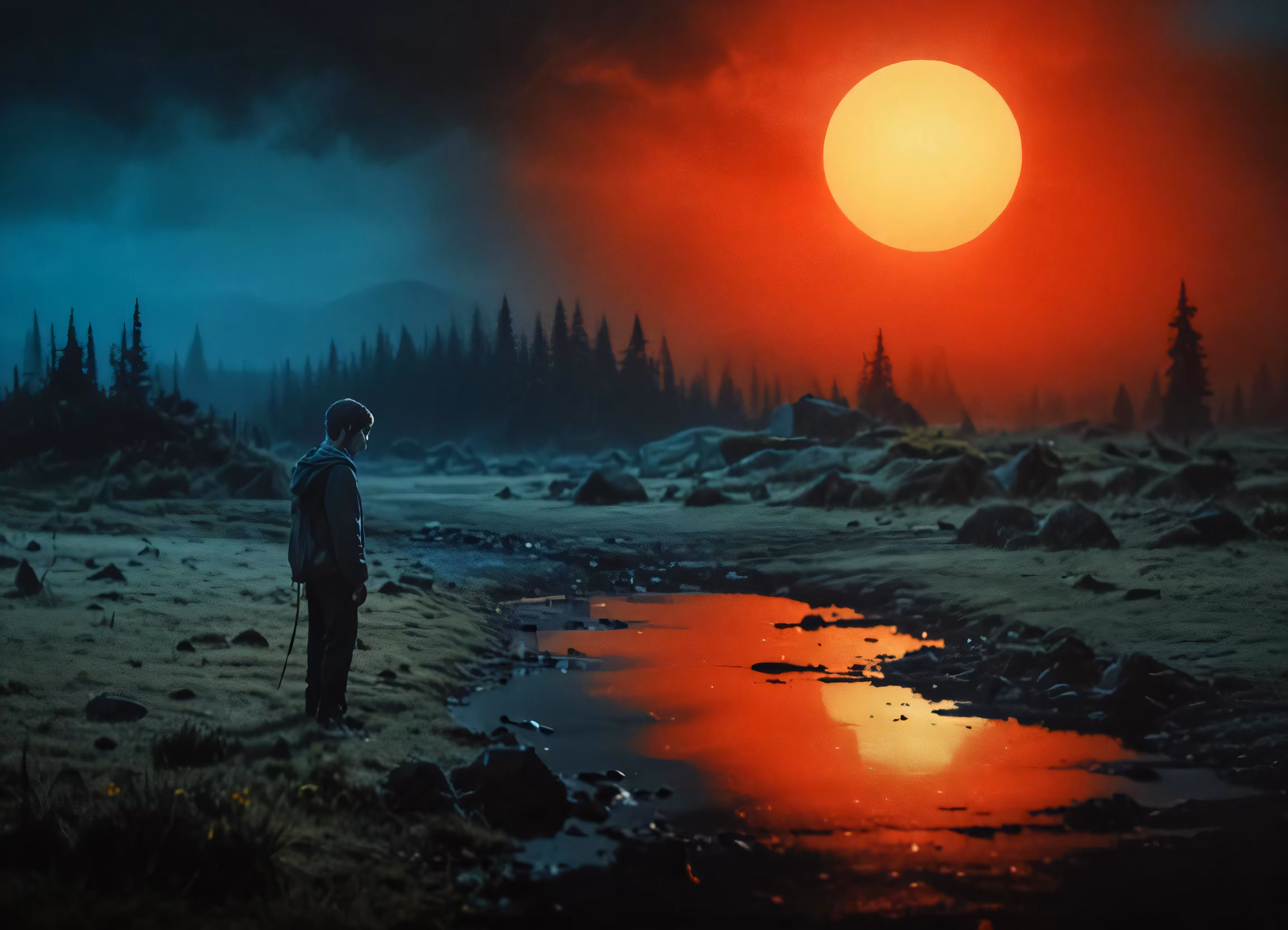 High resolution picture, free to use, the man looks out over the red and yellow sunset as it sets