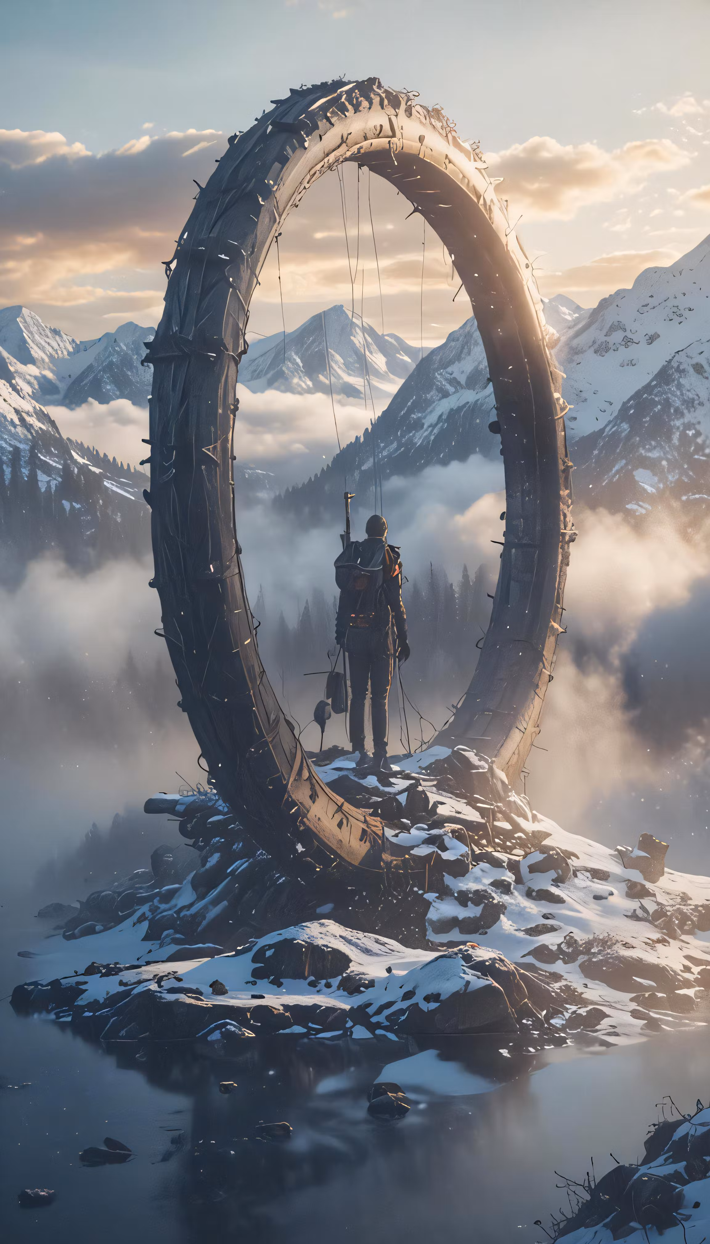 High resolution picture, free to use, the man with the big wheel looks out to the distant mountains