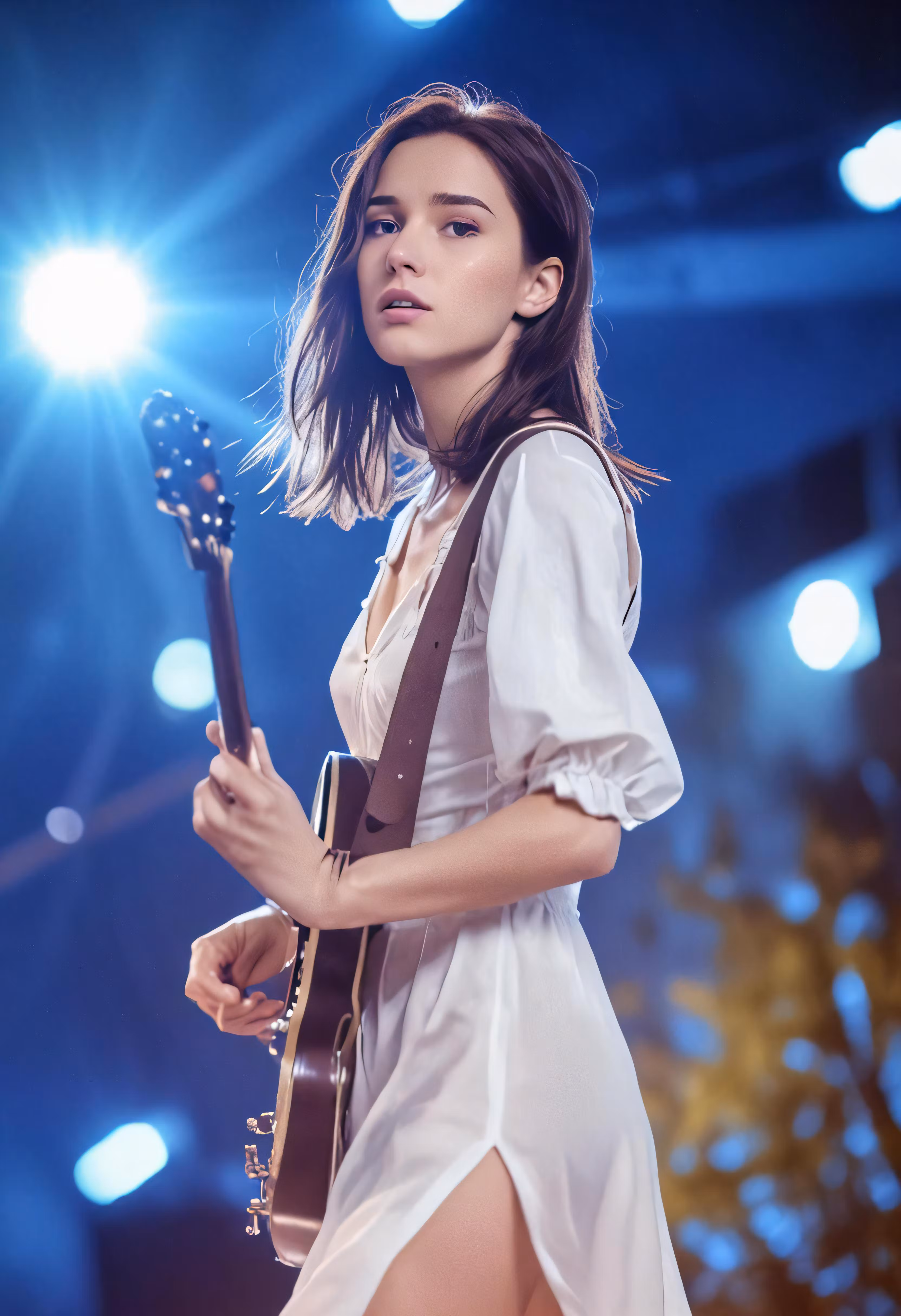 High resolution picture, free to use, the model in a white dress has an electric guitar