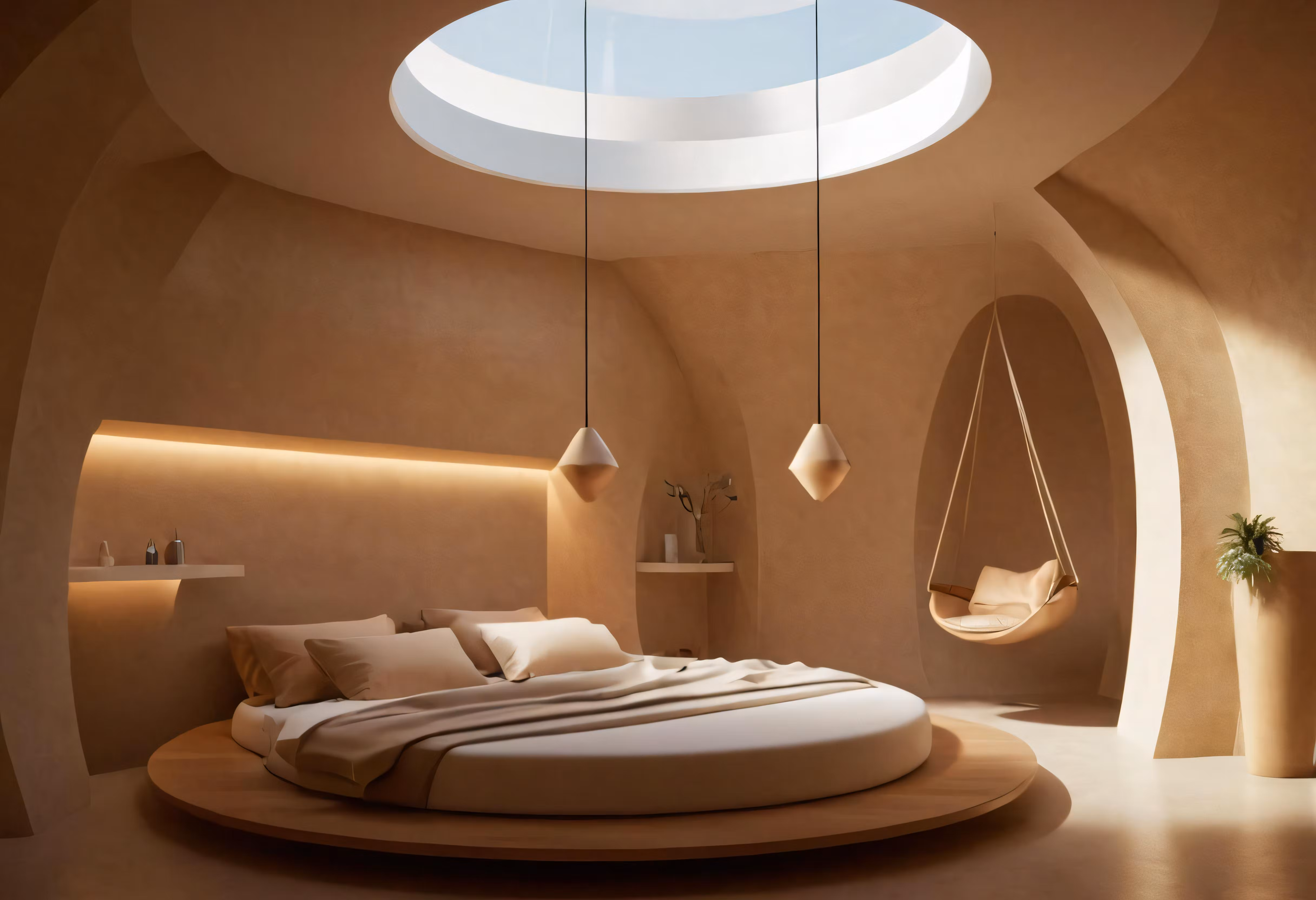 High resolution picture, free to use, the modern room has round shaped bed with hanging lights
