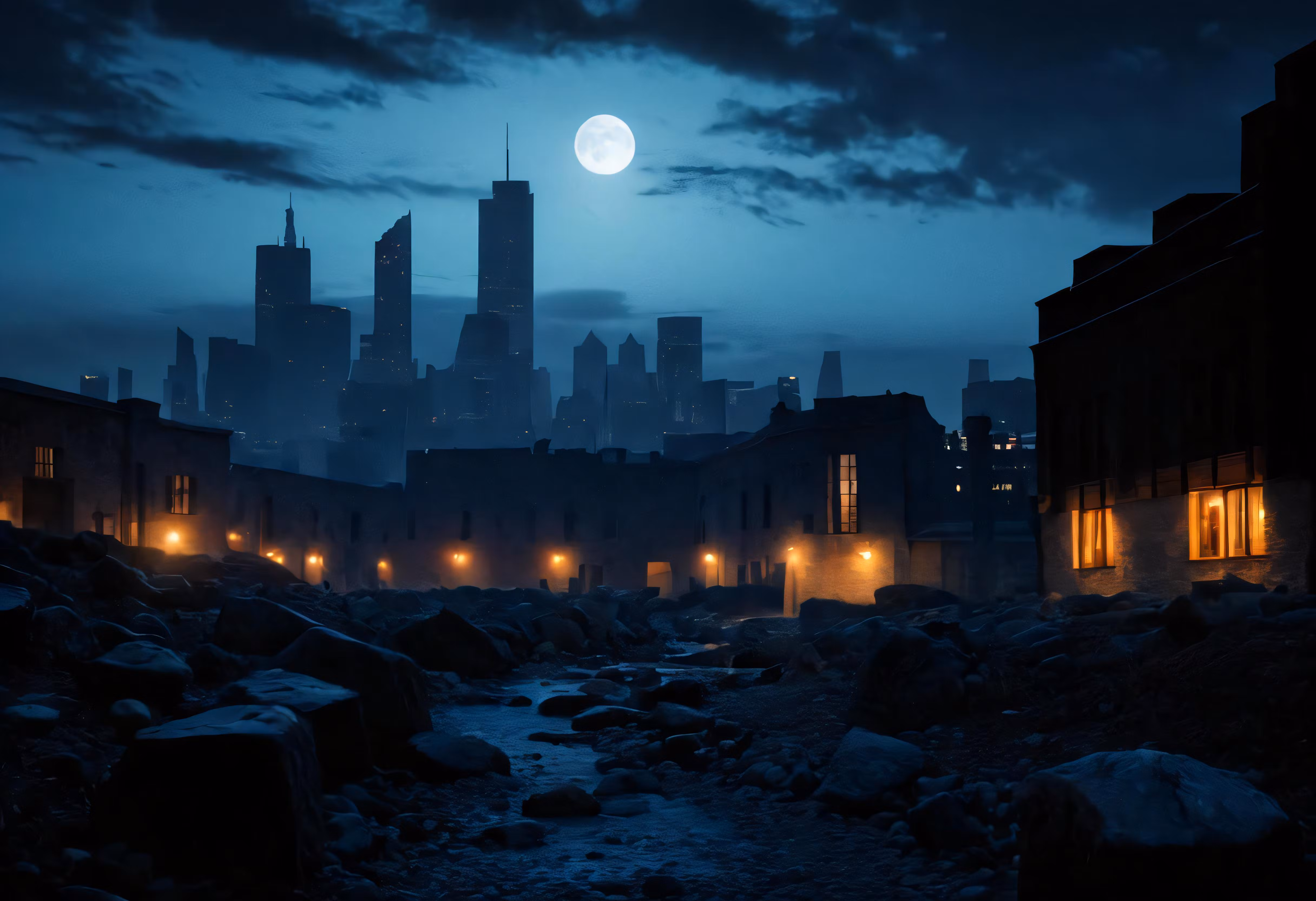 High resolution picture, free to use, the night is illuminated by a full moon over an old city