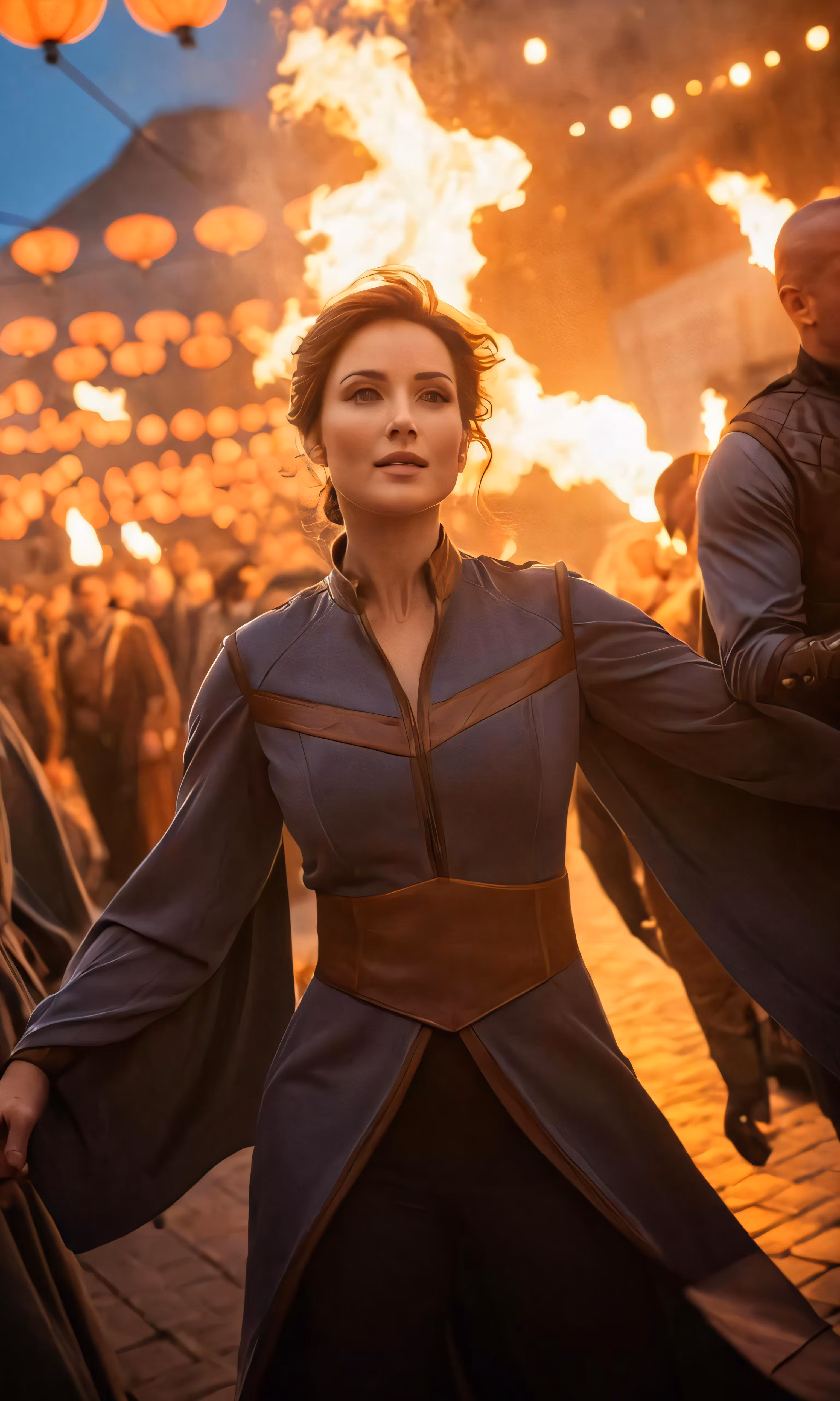 High resolution picture, free to use, the official logo for the 50 /a beautiful woman wearing a dress with a cape standing near a man