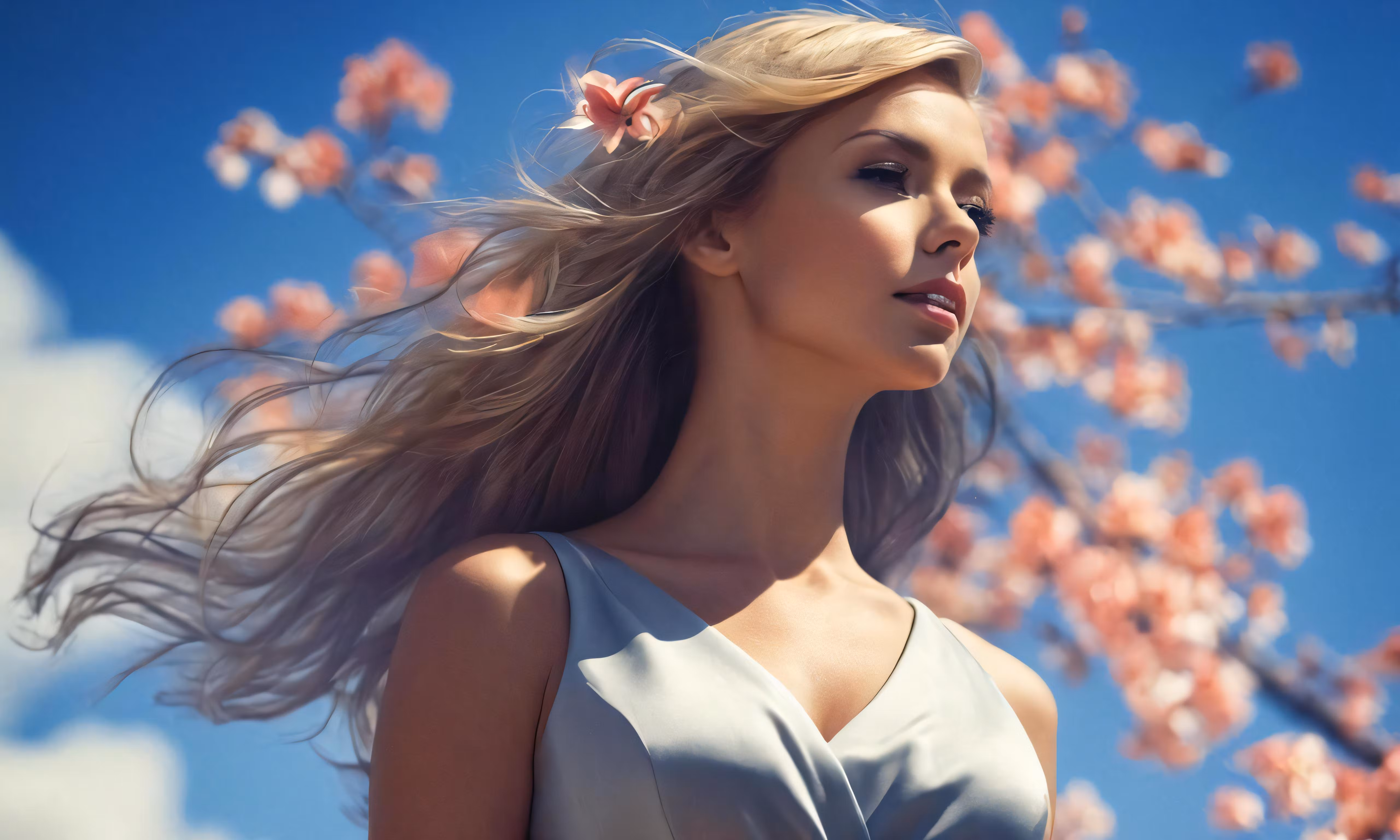 High resolution picture, free to use, the official logo for the 50 /a beautiful young woman with long hair is standing in front of a blooming tree