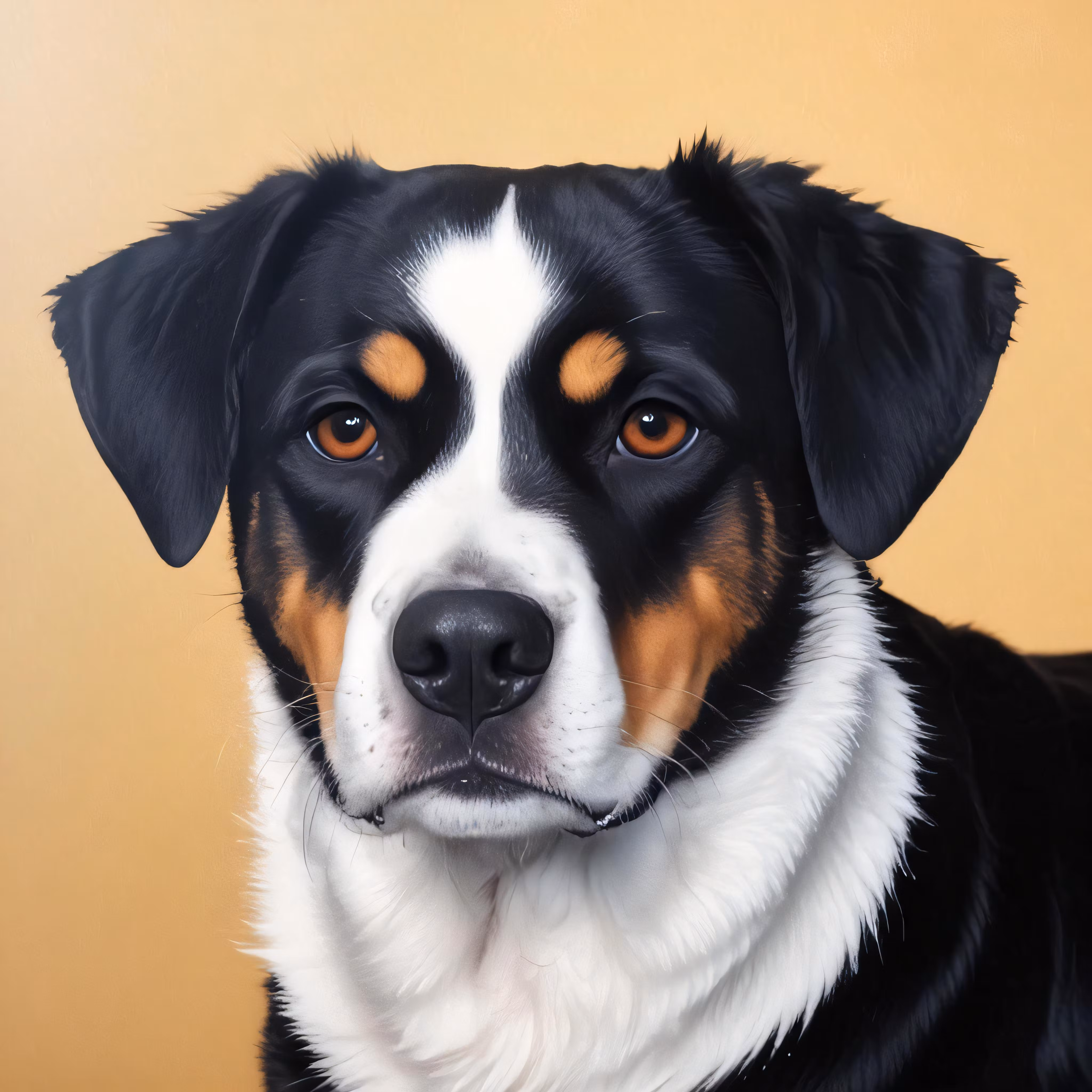 High resolution picture, free to use, the official logo for the 50 /a black, white and brown dog on a yellow background