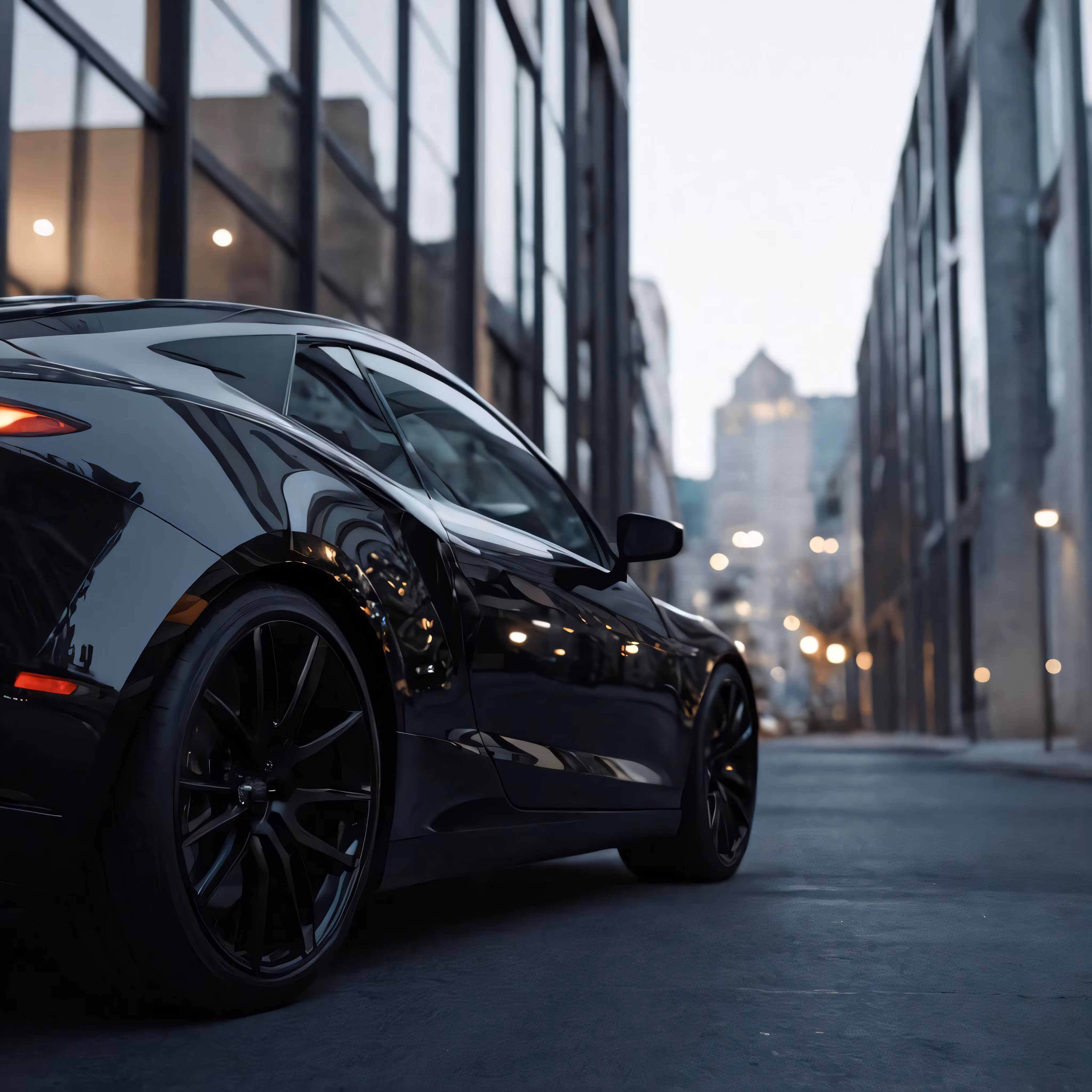High resolution picture, free to use, the official logo for the 50 /a black sports car is parked in front of some tall buildings