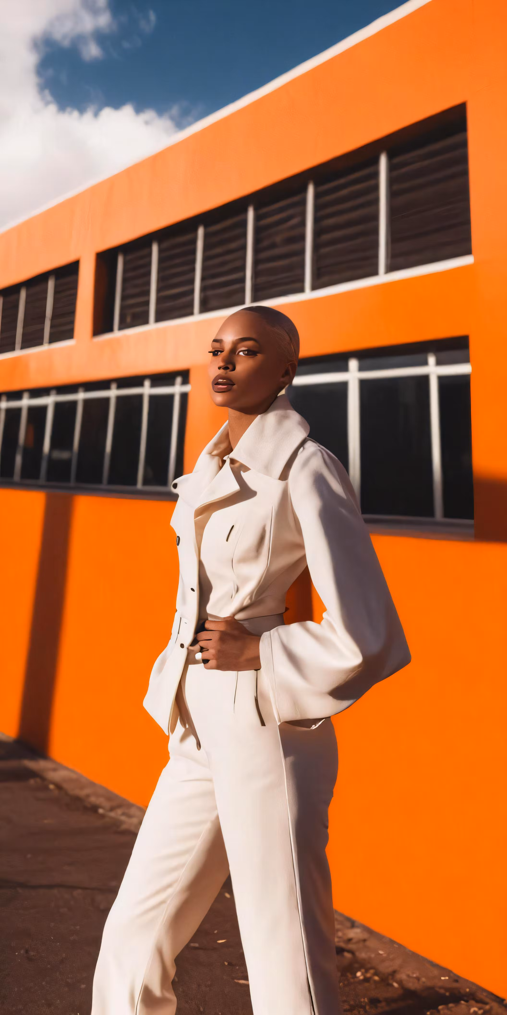High resolution picture, free to use, the official logo for the 50 /a black woman posing on the sidewalk wearing an all white outfit