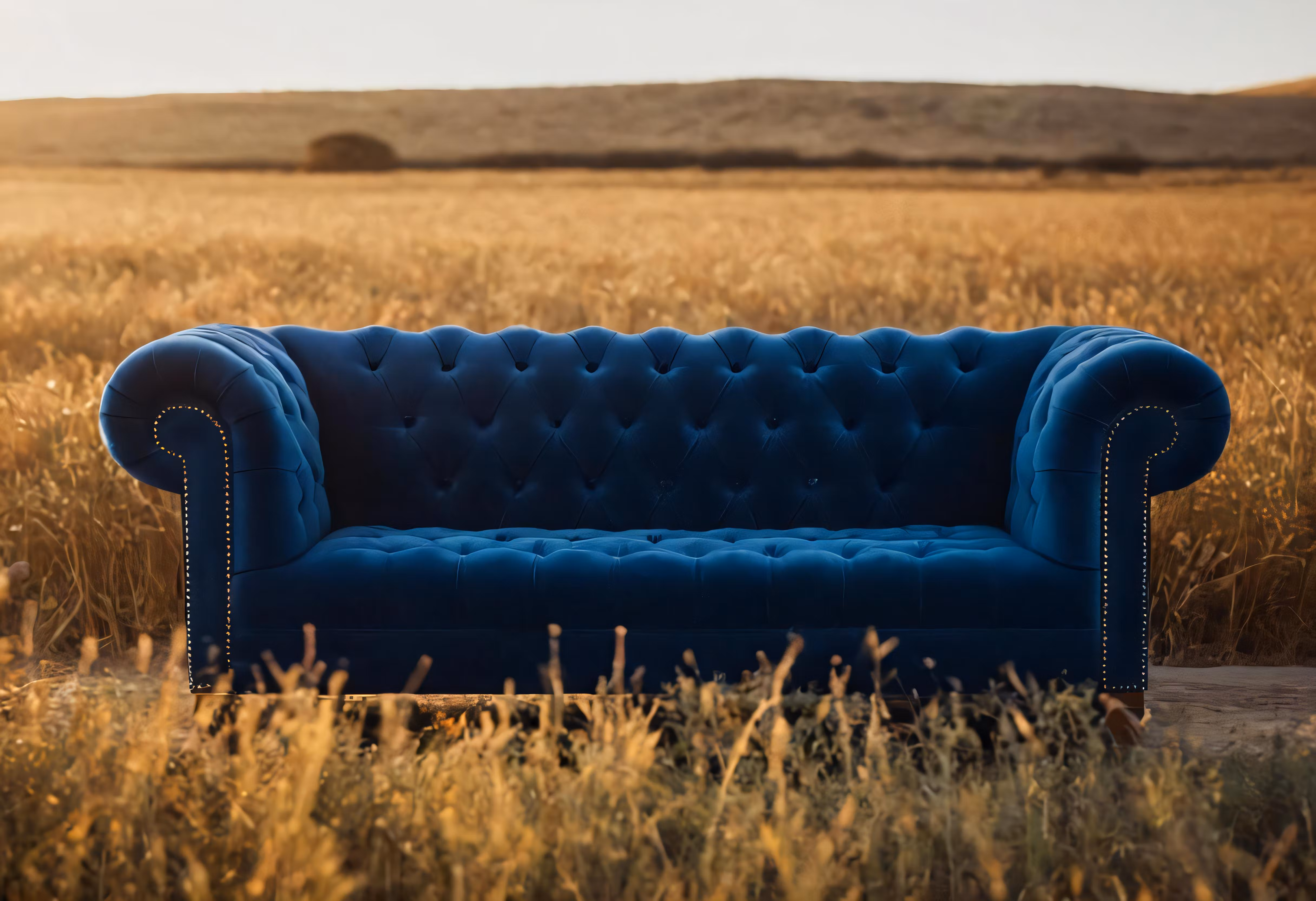 High resolution picture, free to use, the official logo for the 50 /a blue velvet couch in a field of grass