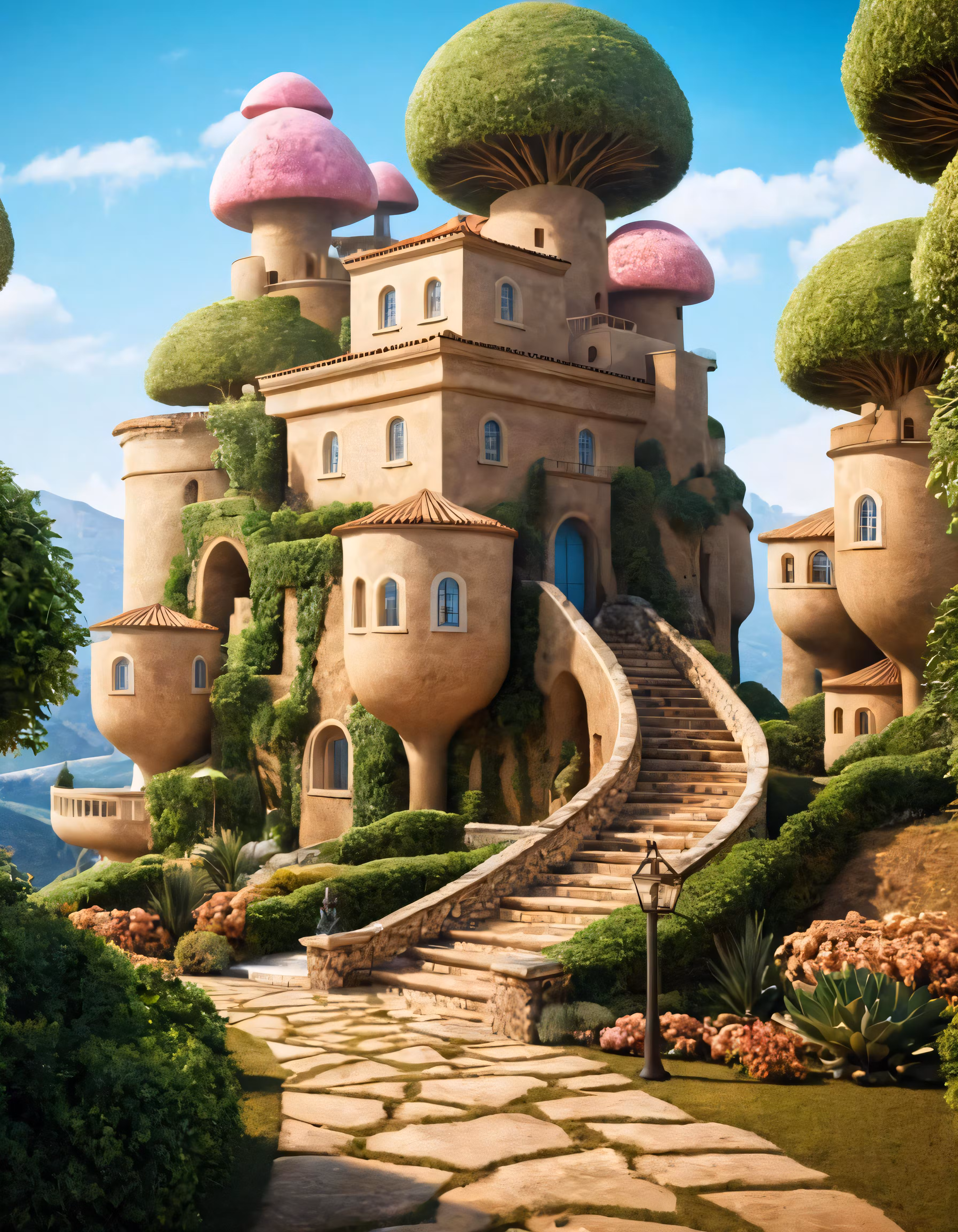 High resolution picture, free to use, the official logo for the 50 /a castle like structure surrounded by greenery with steps leading to it