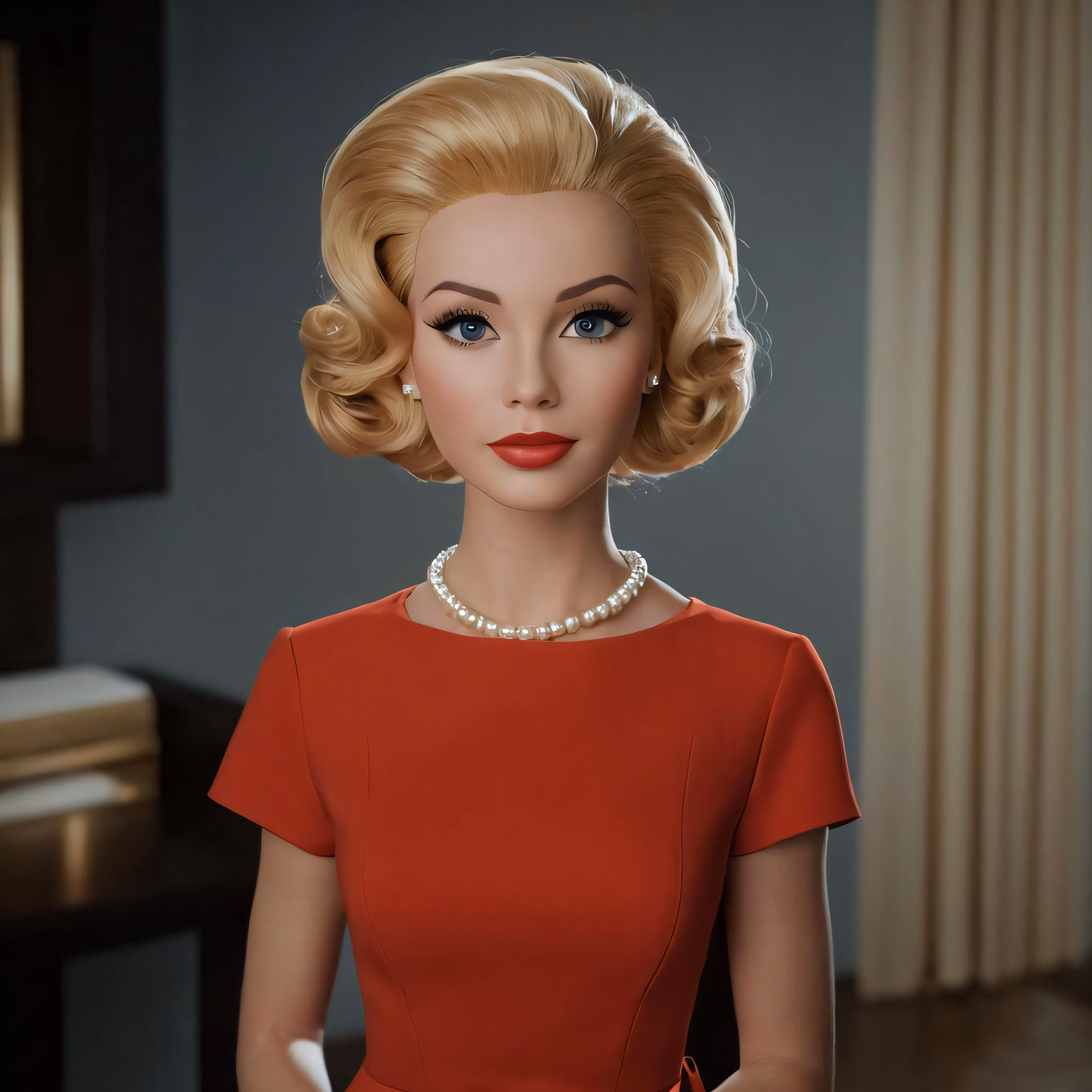 High resolution picture, free to use, the official logo for the 50 /a doll dressed up in a red dress with a white bracelet