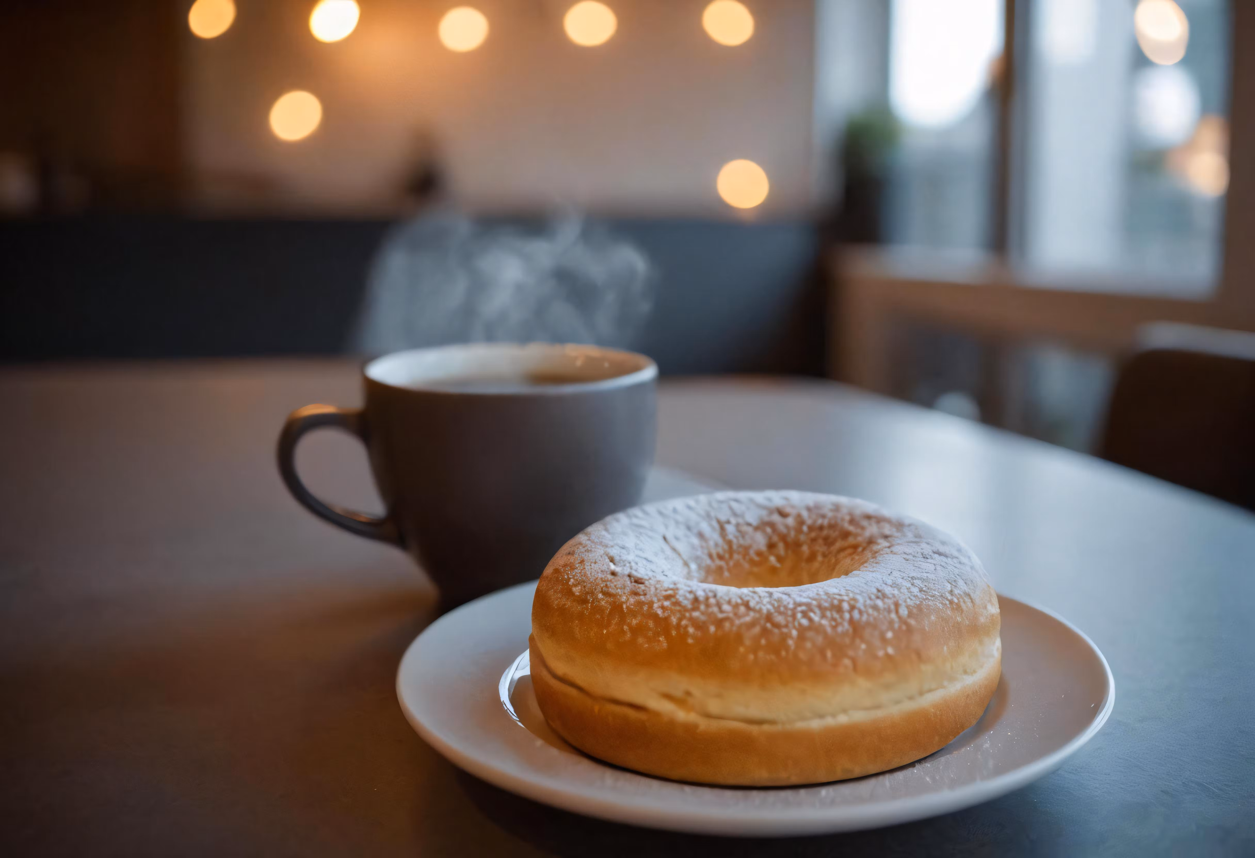 High resolution picture, free to use, the official logo for the 50 /a doughnut is sitting on a plate next to a cup of coffee
