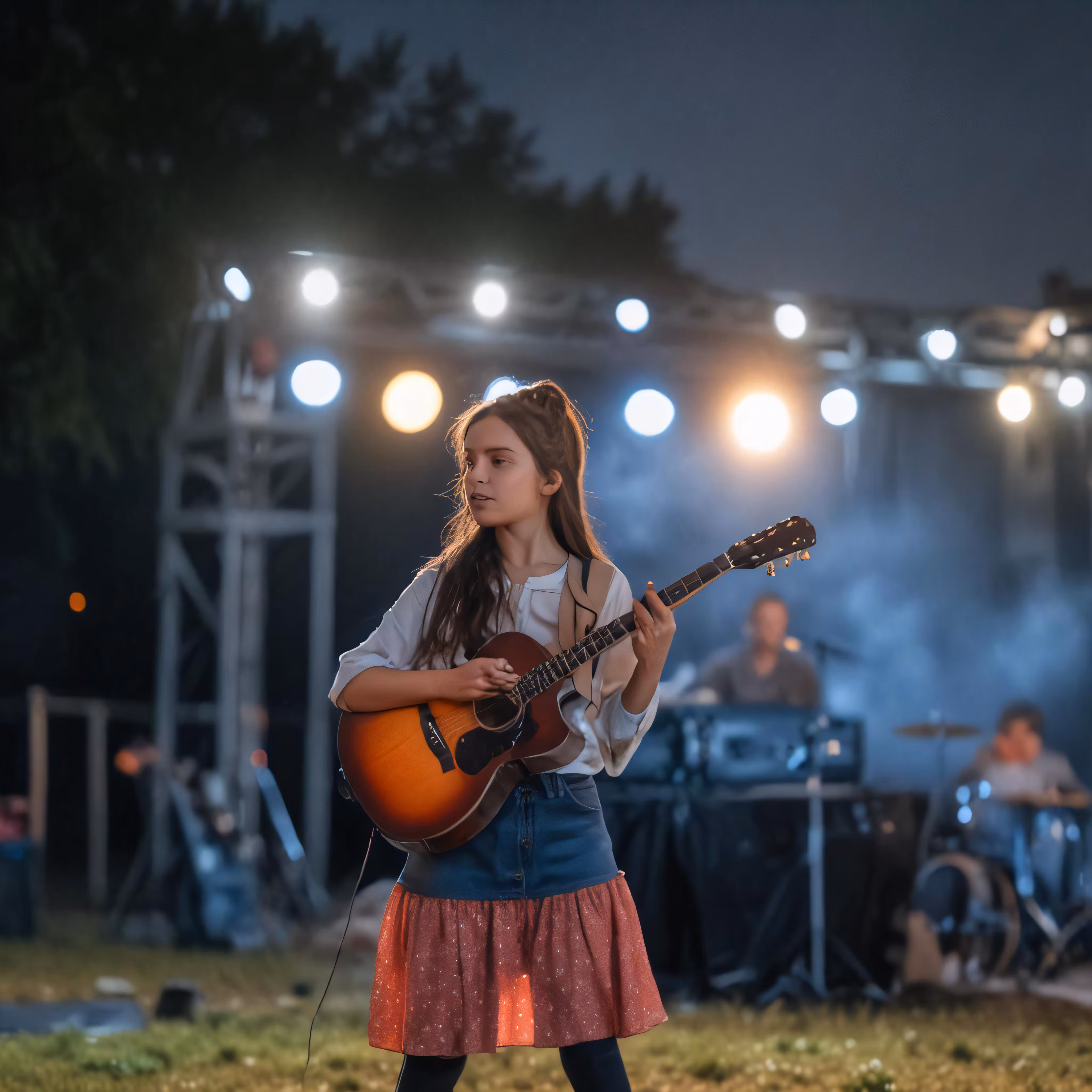 High resolution picture, free to use, the official logo for the 50 /a girl is standing on the grass playing the guitar