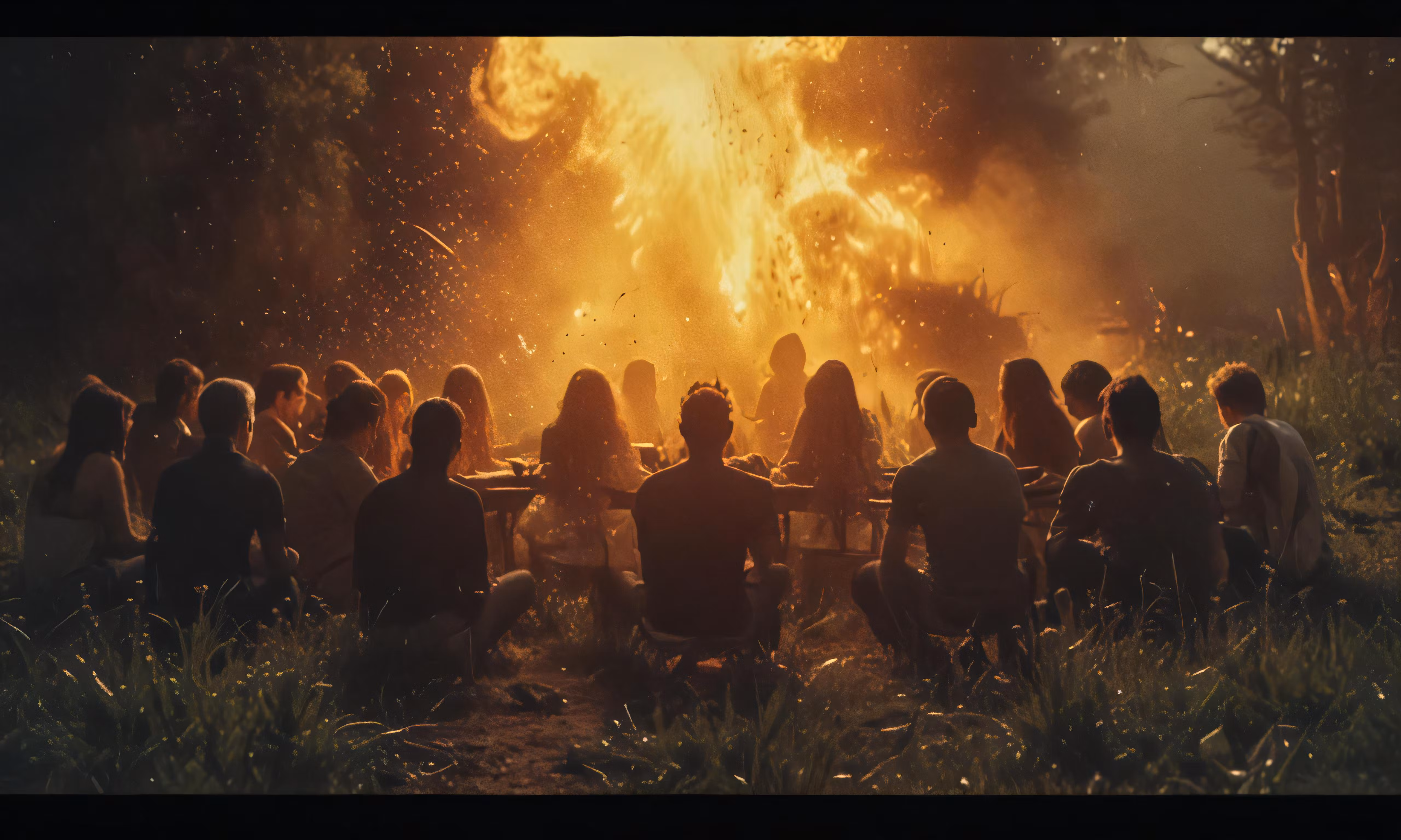 High resolution picture, free to use, the official logo for the 50 /a group of people gather in a field near a fire