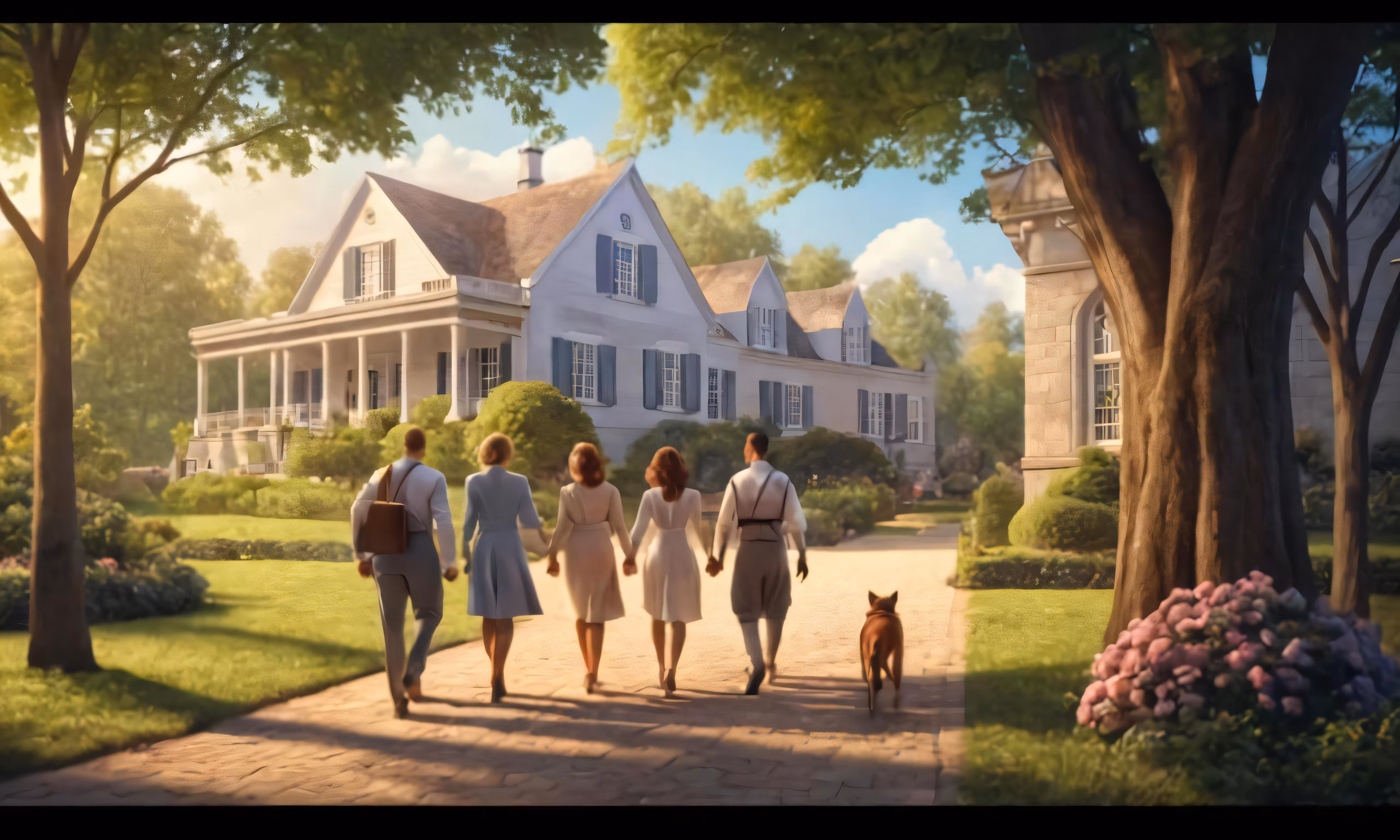 High resolution picture, free to use, the official logo for the 50 /a group of people walking in the middle of a yard with a dog