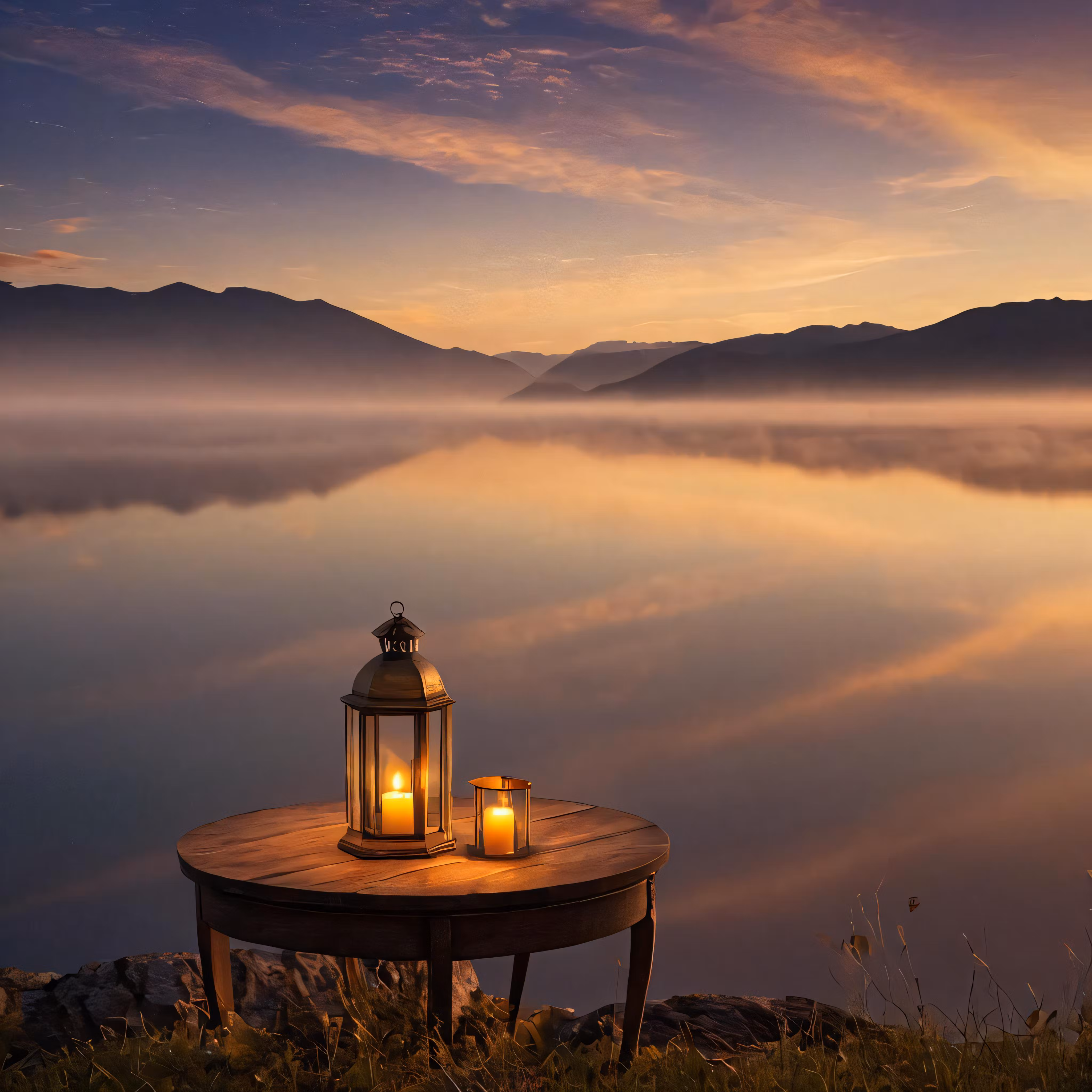 High resolution picture, free to use, the official logo for the 50 /a lamp sitting on top of a wooden table next to a lake