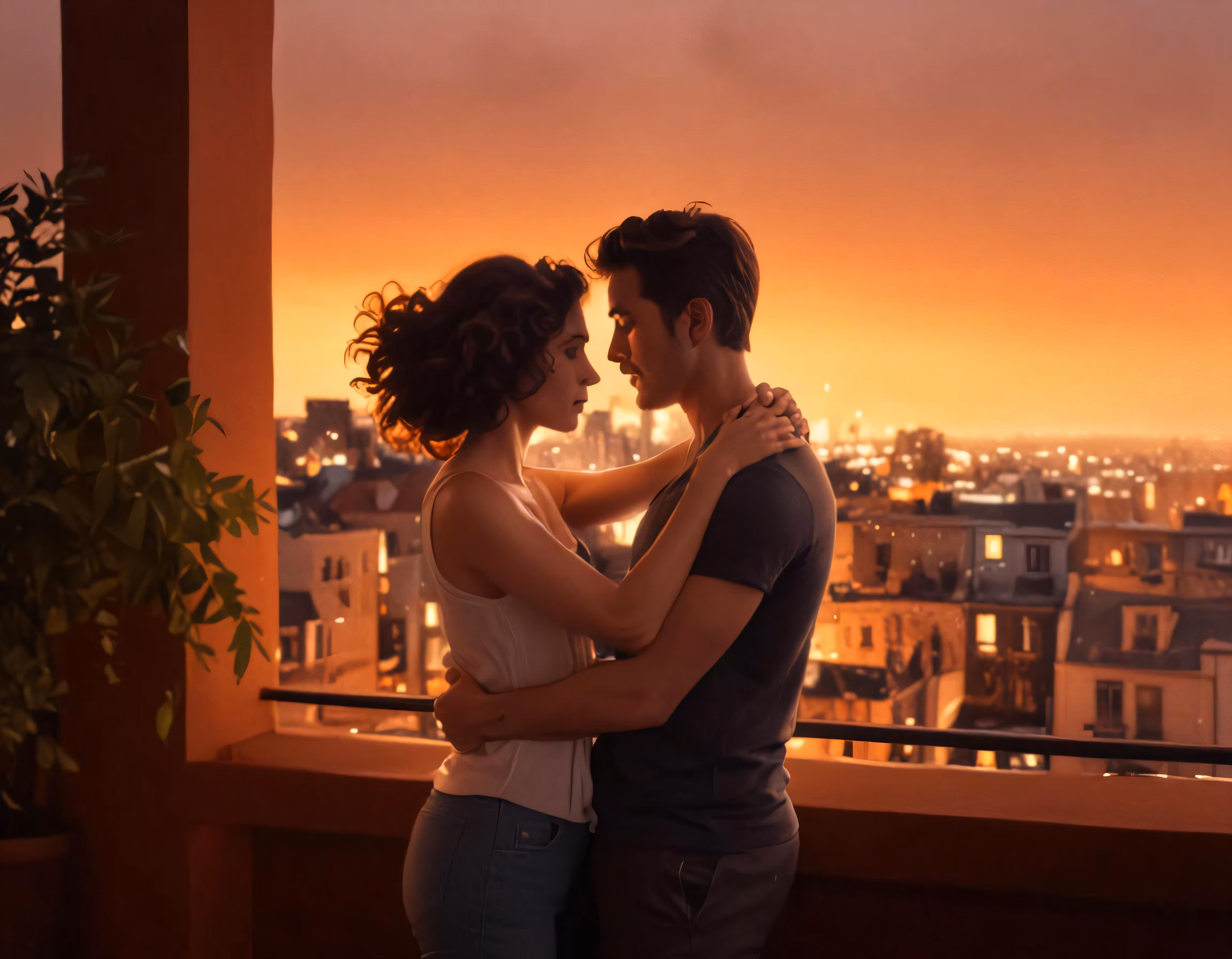 High resolution picture, free to use, the official logo for the 50 /a man and woman embracing with city lights behind them