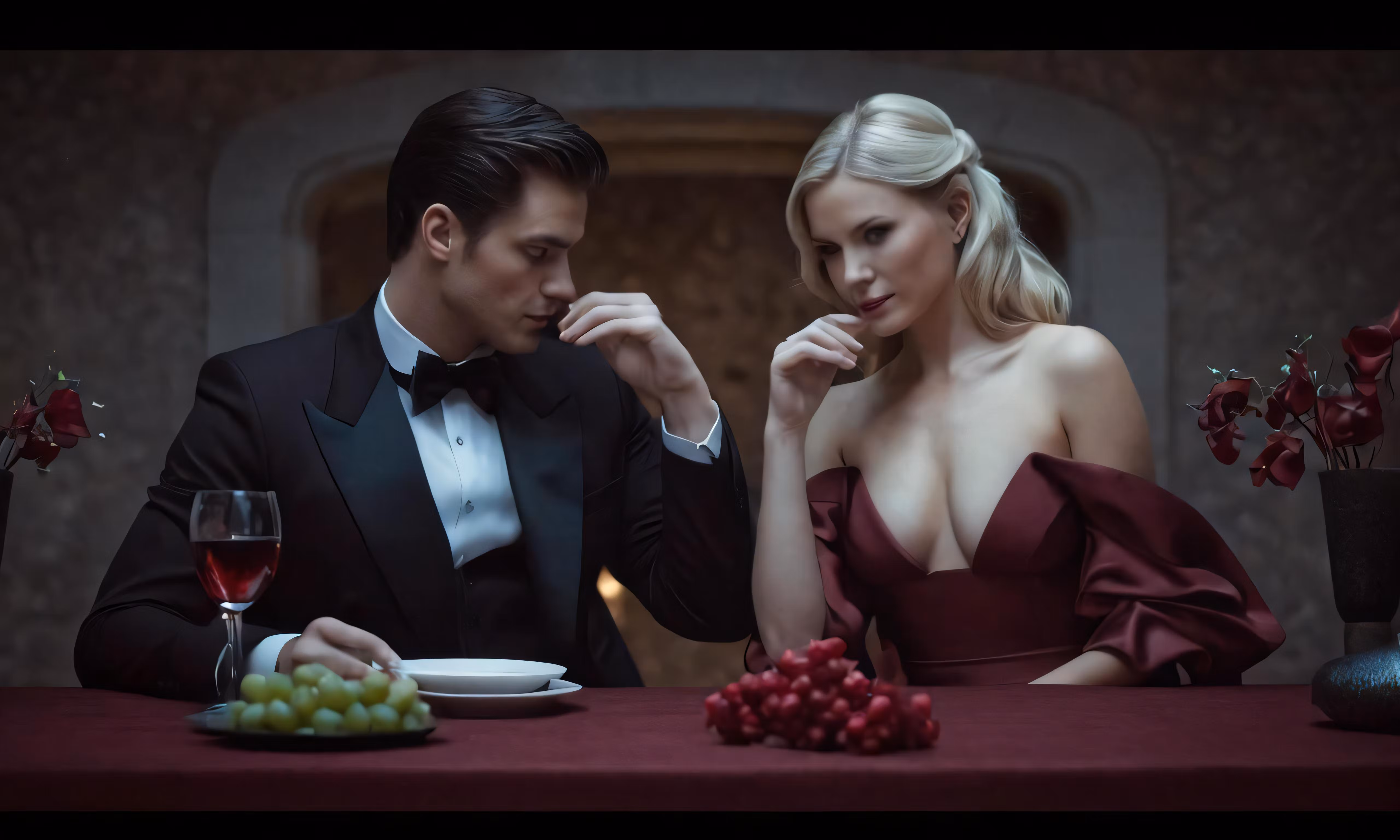 High resolution picture, free to use, the official logo for the 50 /a man in tuxedo and woman in red dress sit at a dinner table, next to red grapes