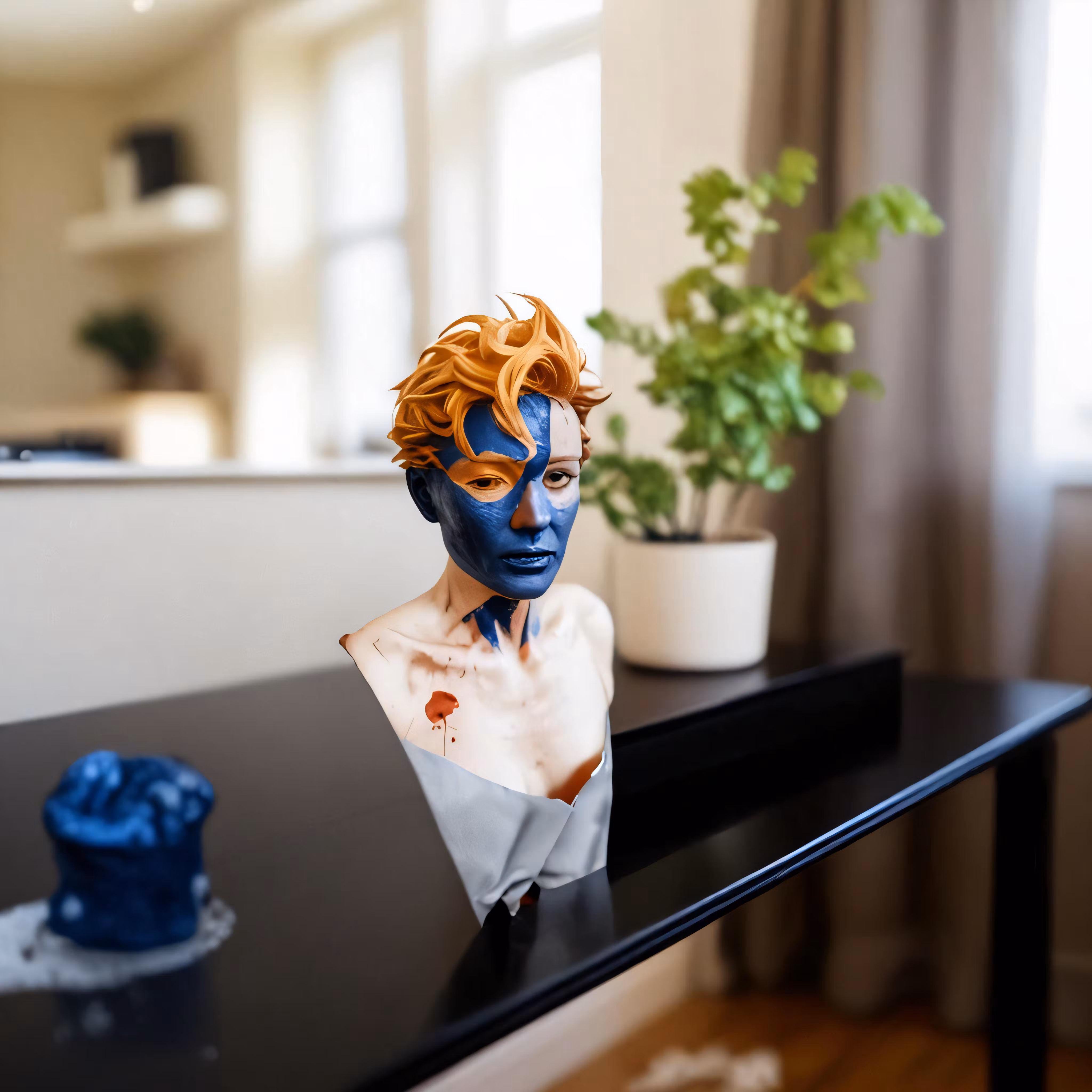 High resolution picture, free to use, the official logo for the 50 /a man with blue face and white makeup sitting on a piano