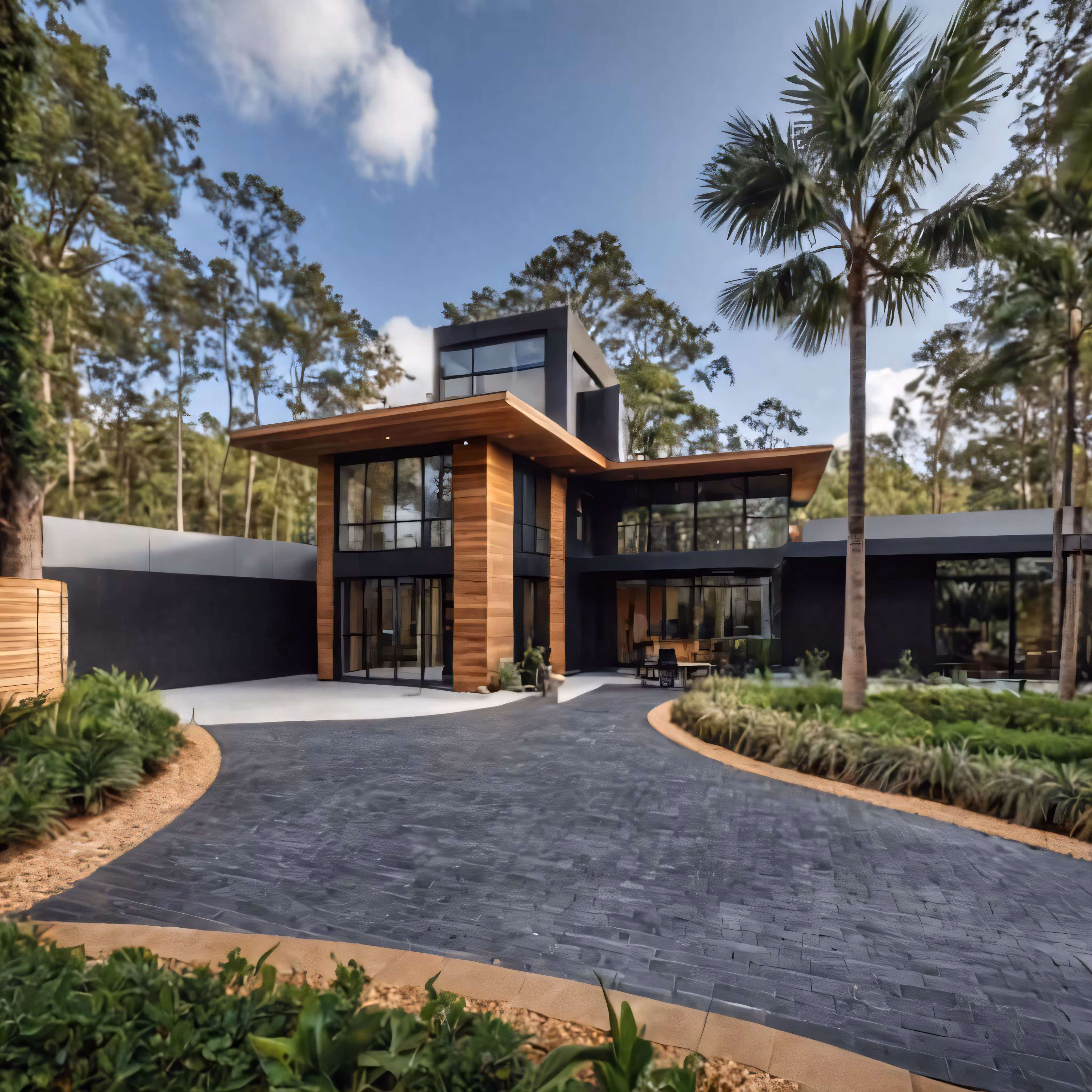 High resolution picture, free to use, the official logo for the 50 /a modern house that is surrounded by trees and shrubs