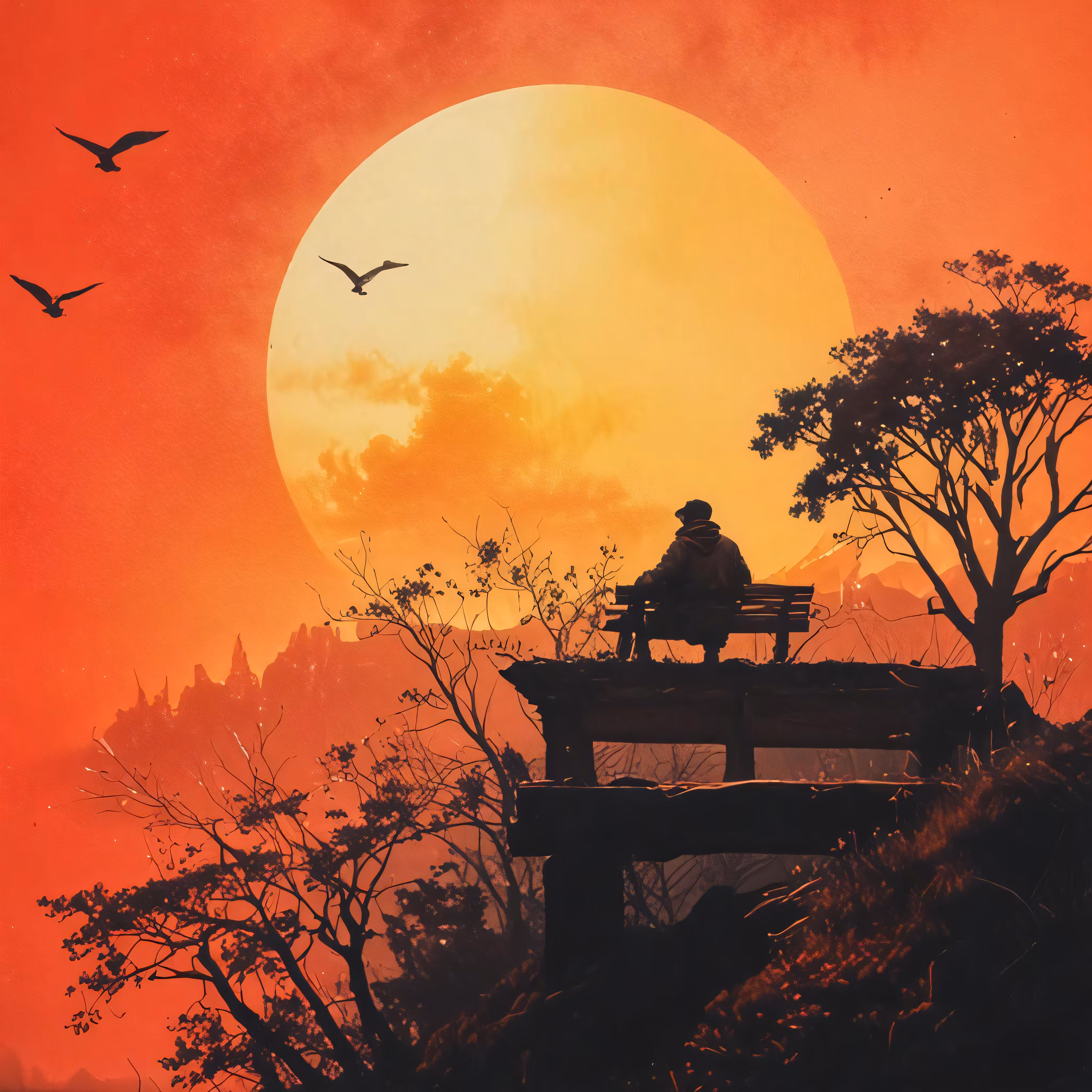 High resolution picture, free to use, the official logo for the 50 /a person sitting on a bench overlooking the sunset