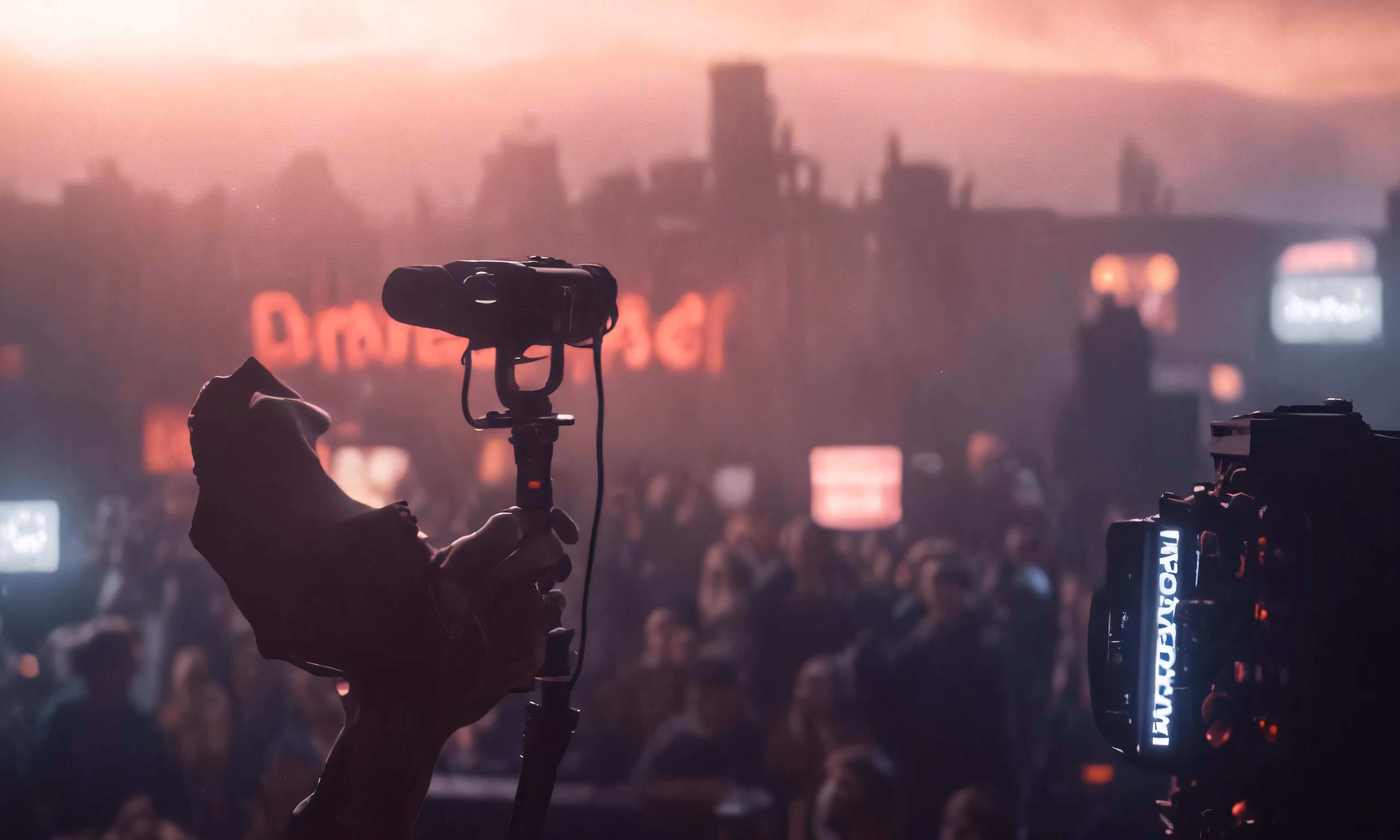 High resolution picture, free to use, the official logo for the 50 /a person with cameras in the middle of a crowd