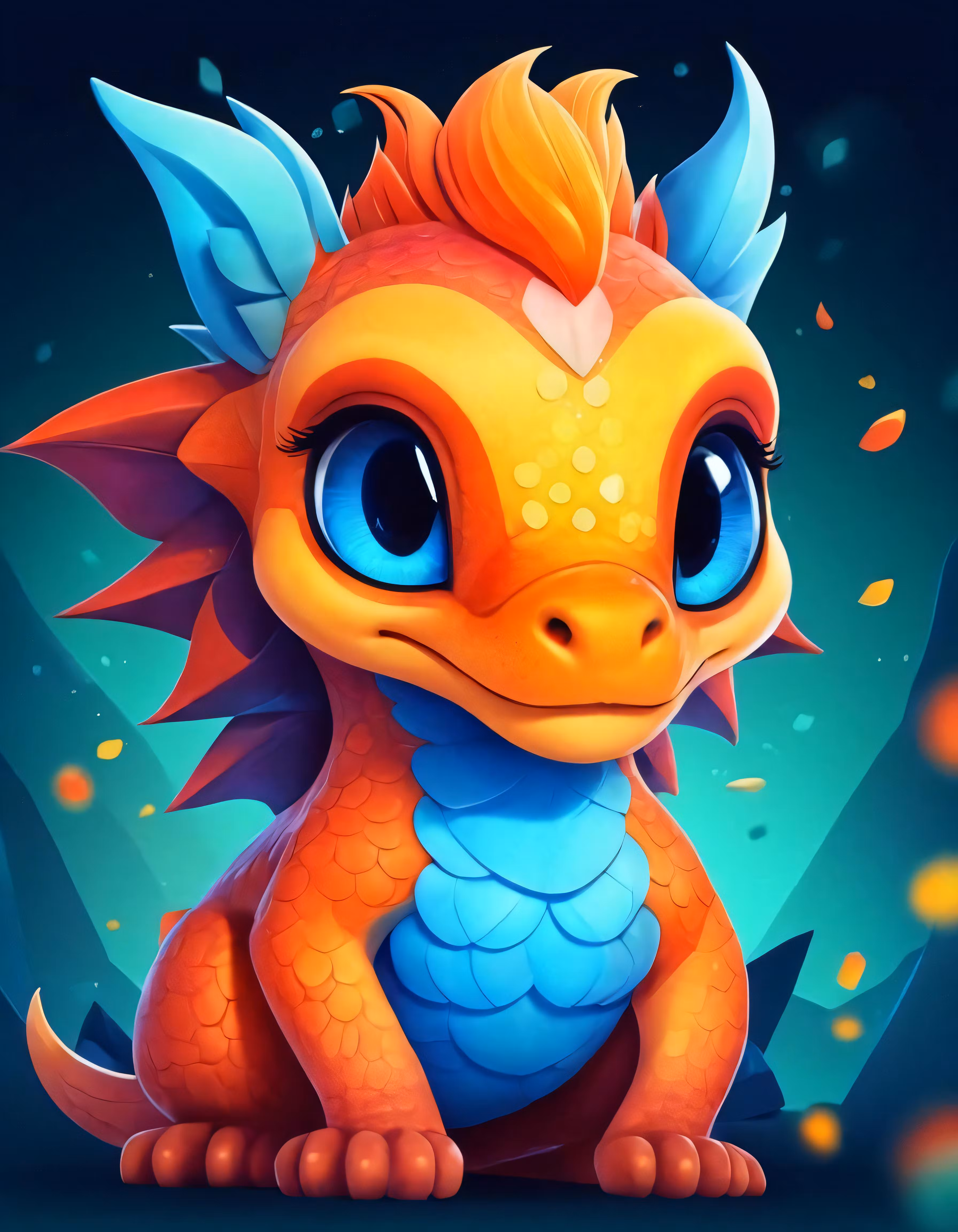 High resolution picture, free to use, the official logo for the 50 /a small orange and blue dragon sitting on top of a green hill