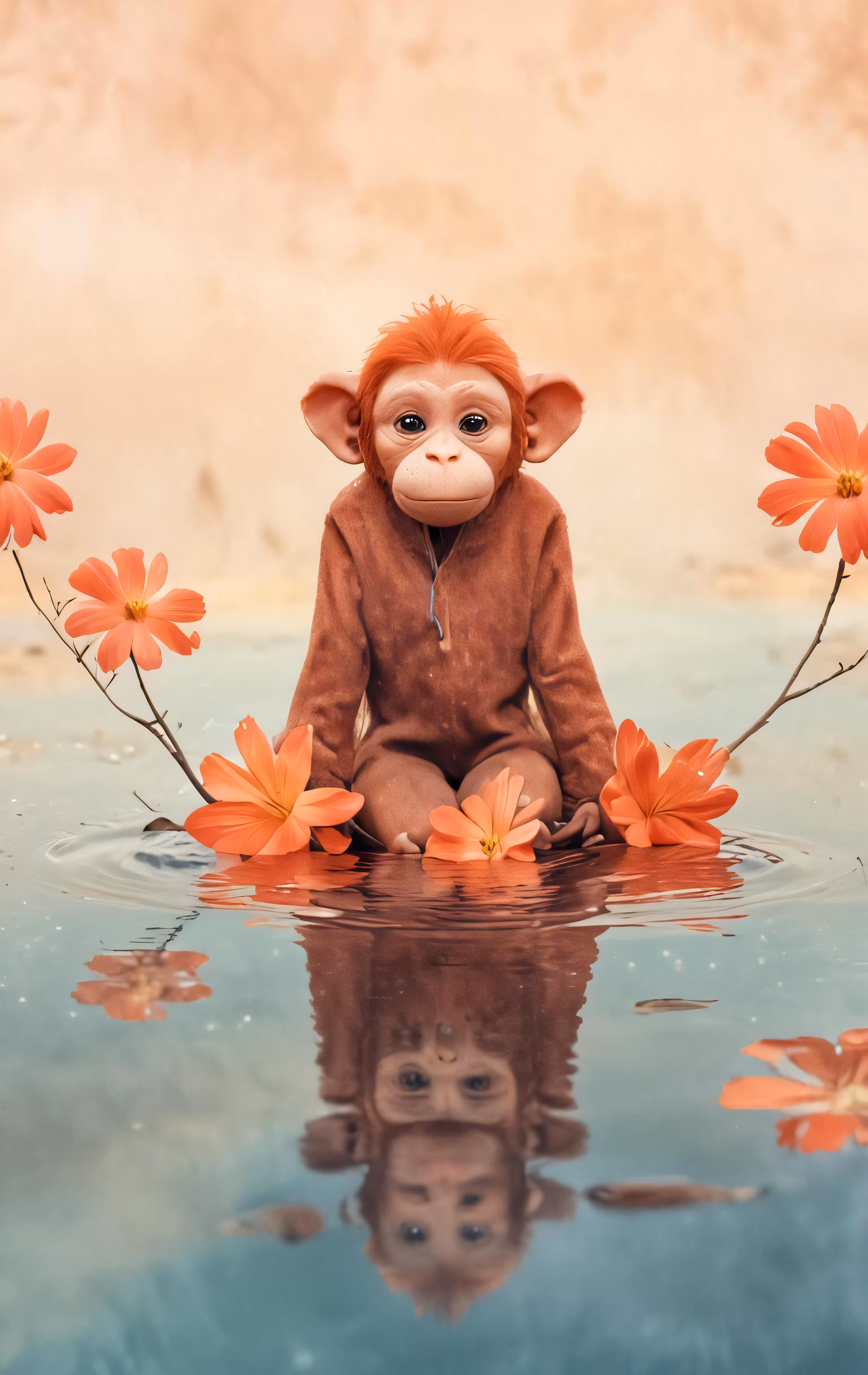 High resolution picture, free to use, the official logo for the 50 /a stuffed monkey with red hair sitting in the water with flowers