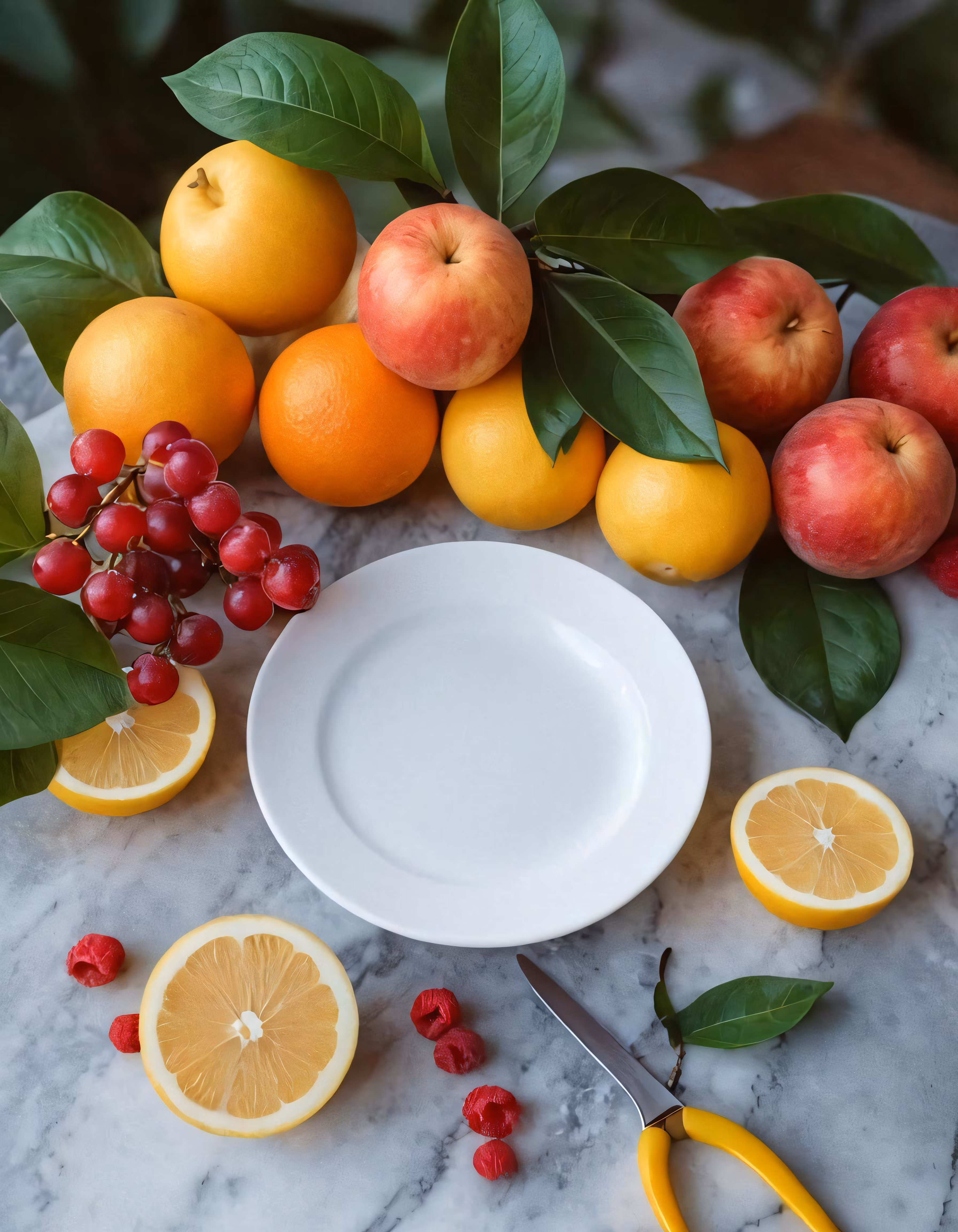 High resolution picture, free to use, the official logo for the 50 /a table topped with a plate of fruit and knife