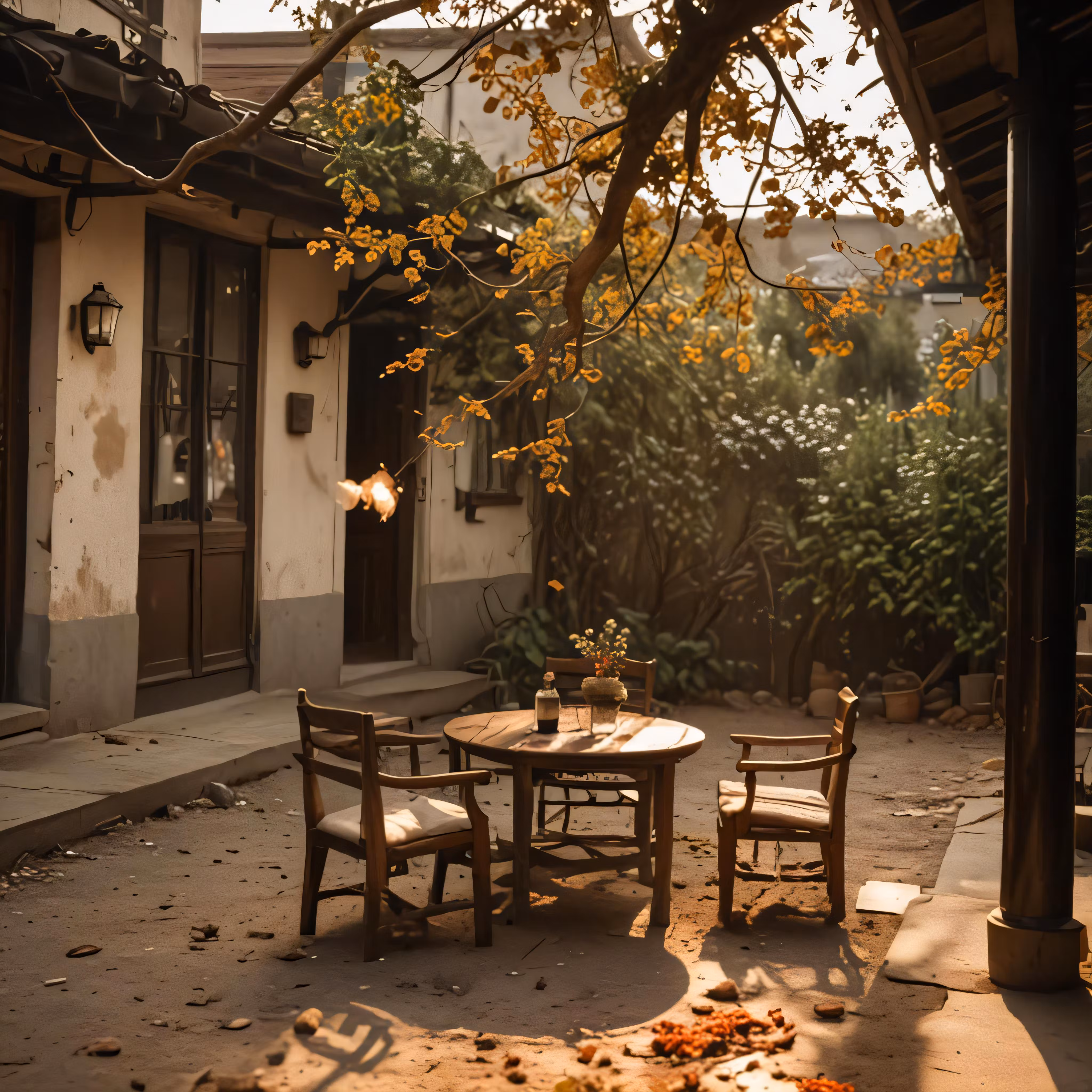 High resolution picture, free to use, the official logo for the 50 /a table with chairs under a tree and an open door