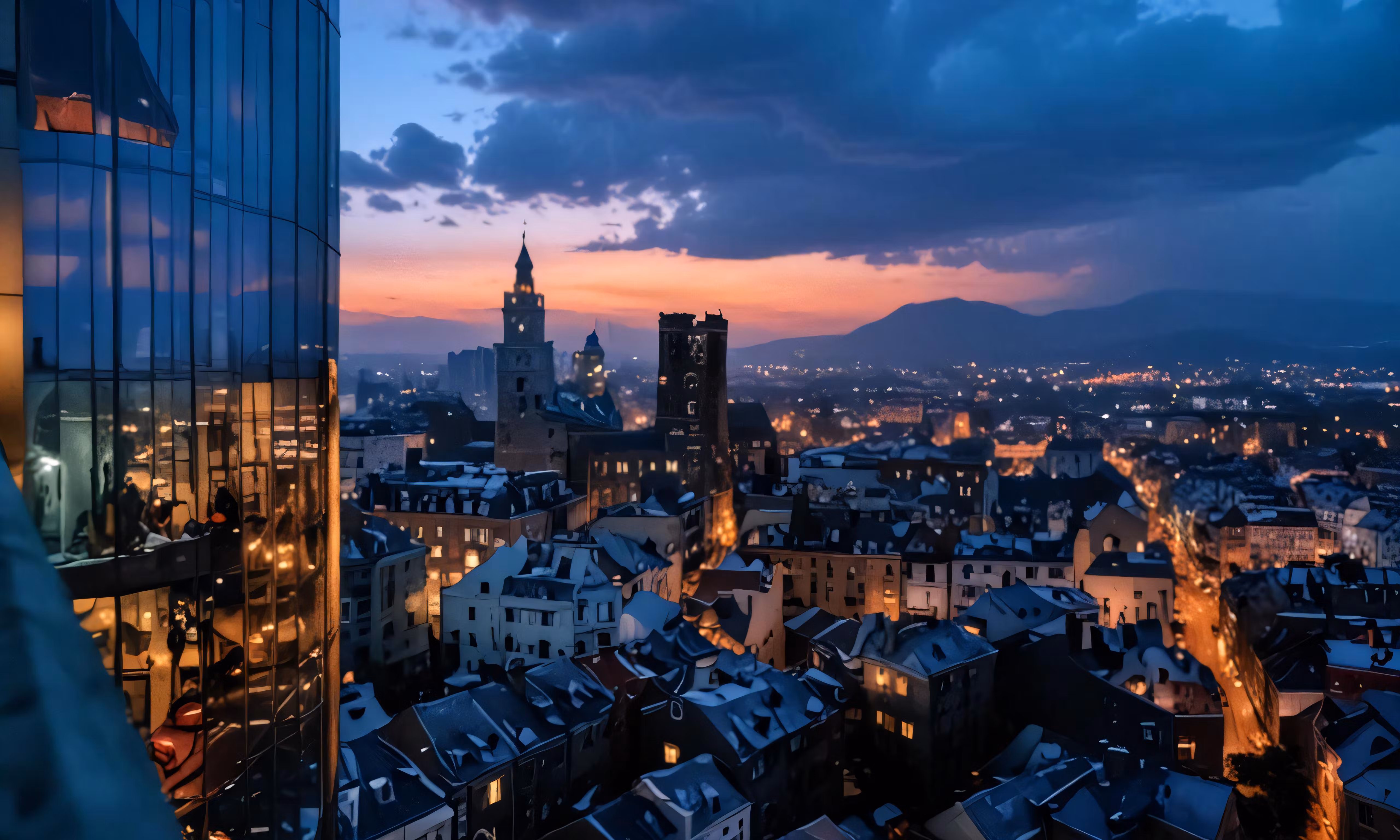 High resolution picture, free to use, the official logo for the 50 /a very cloudy sky is seen above a city