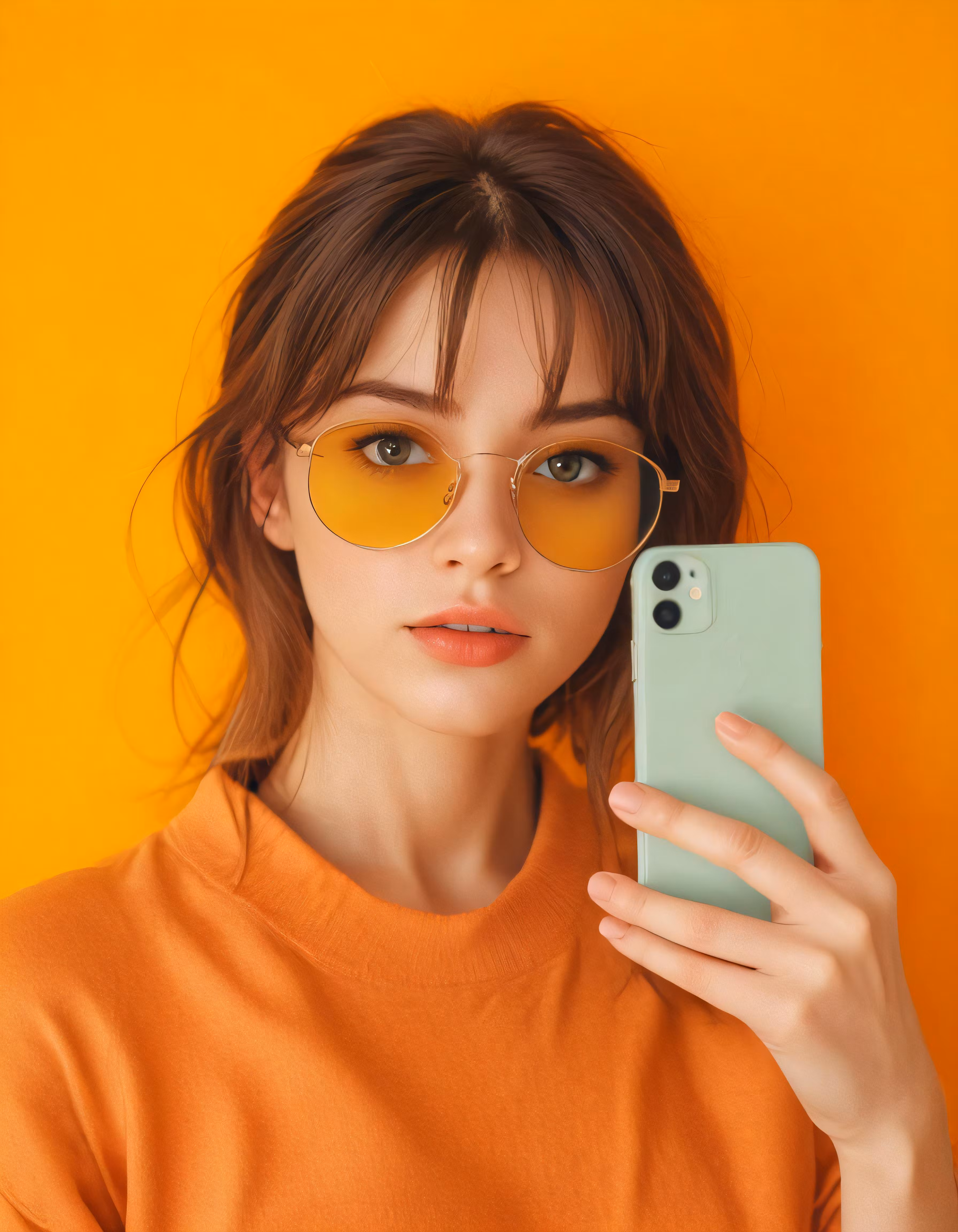 High resolution picture, free to use, the official logo for the 50 /a woman holding a cellphone and wearing glasses