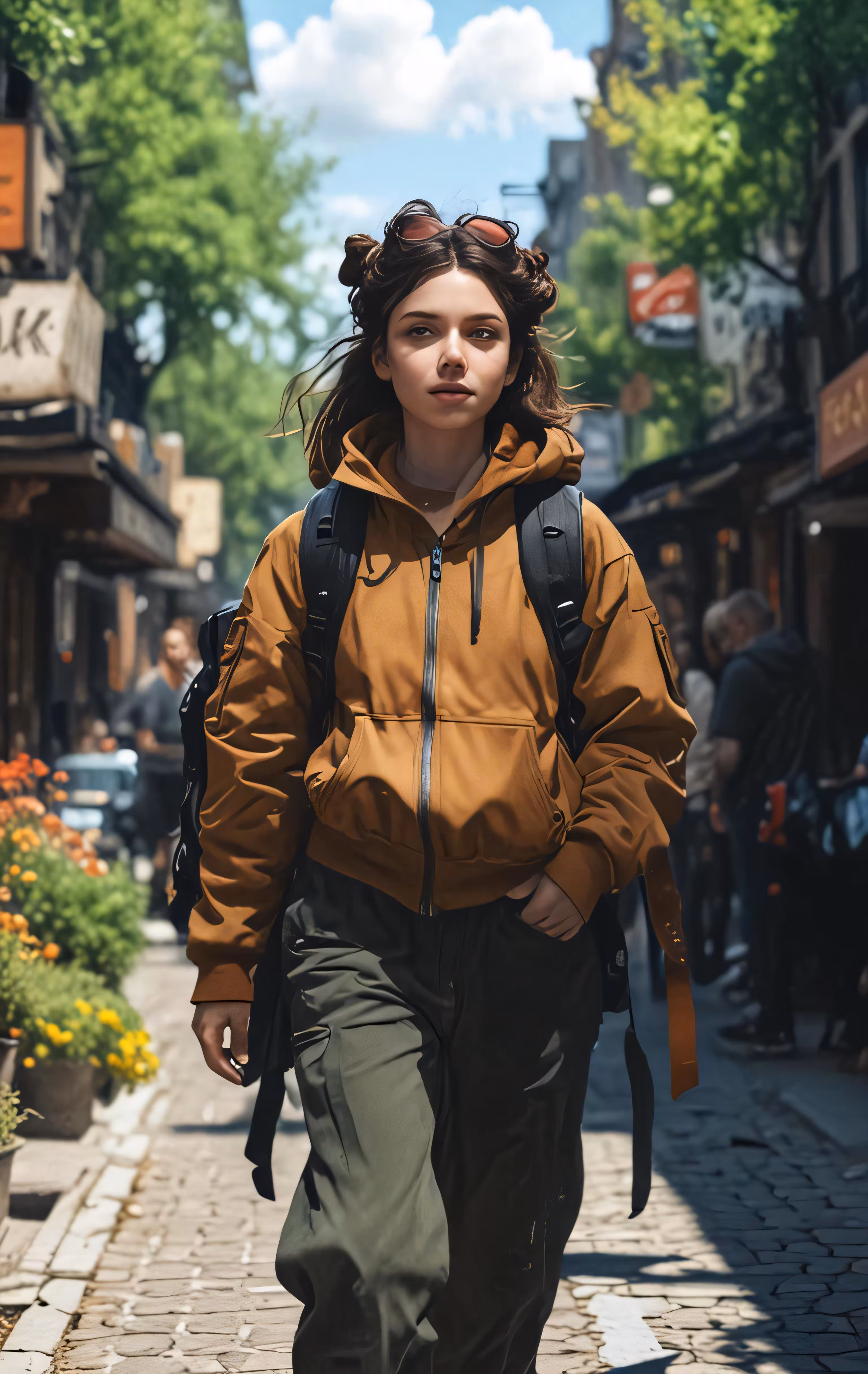 High resolution picture, free to use, the official logo for the 50 /a woman in a tan jacket walks down the street
