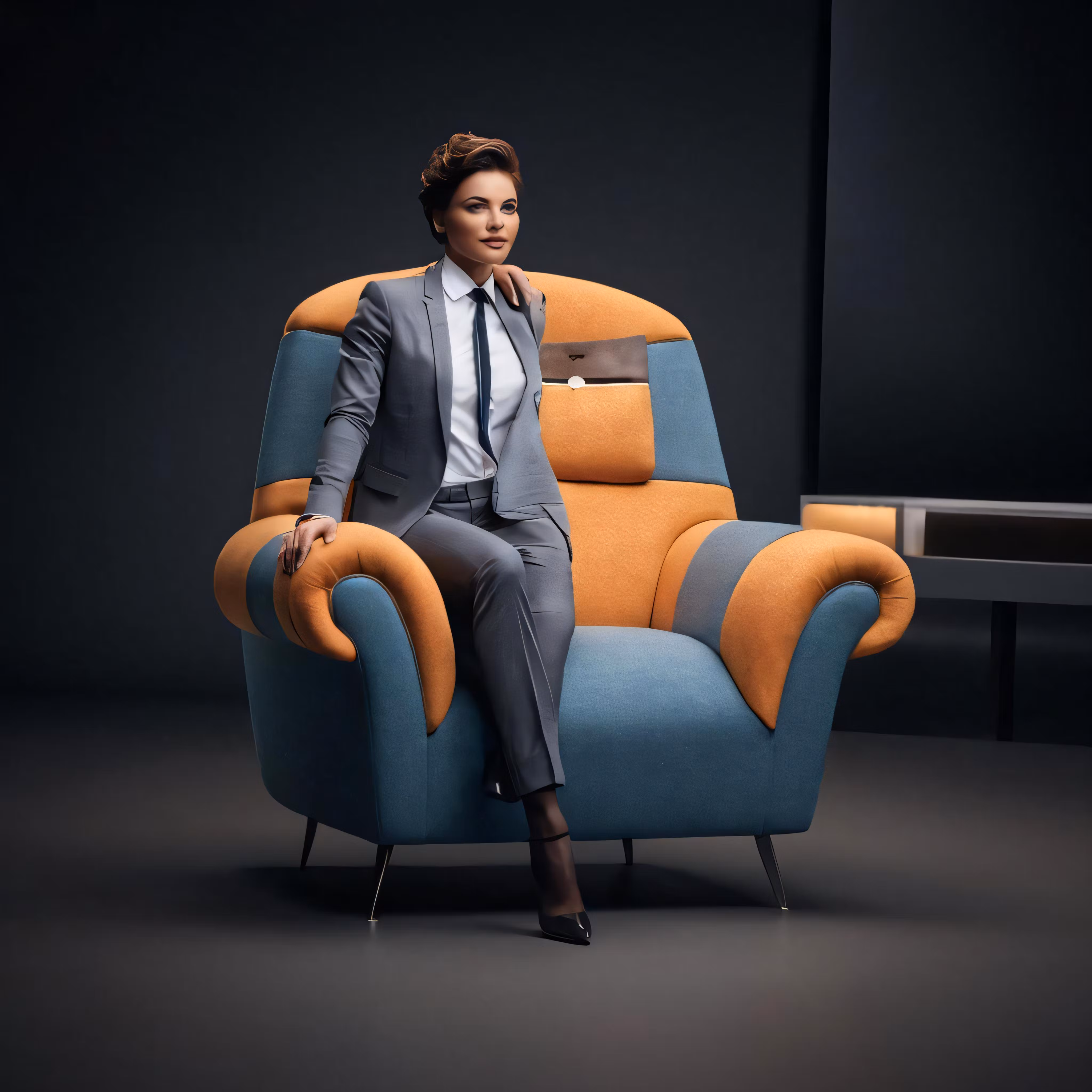 High resolution picture, free to use, the official logo for the 50 /a woman in business attire sitting on a chair