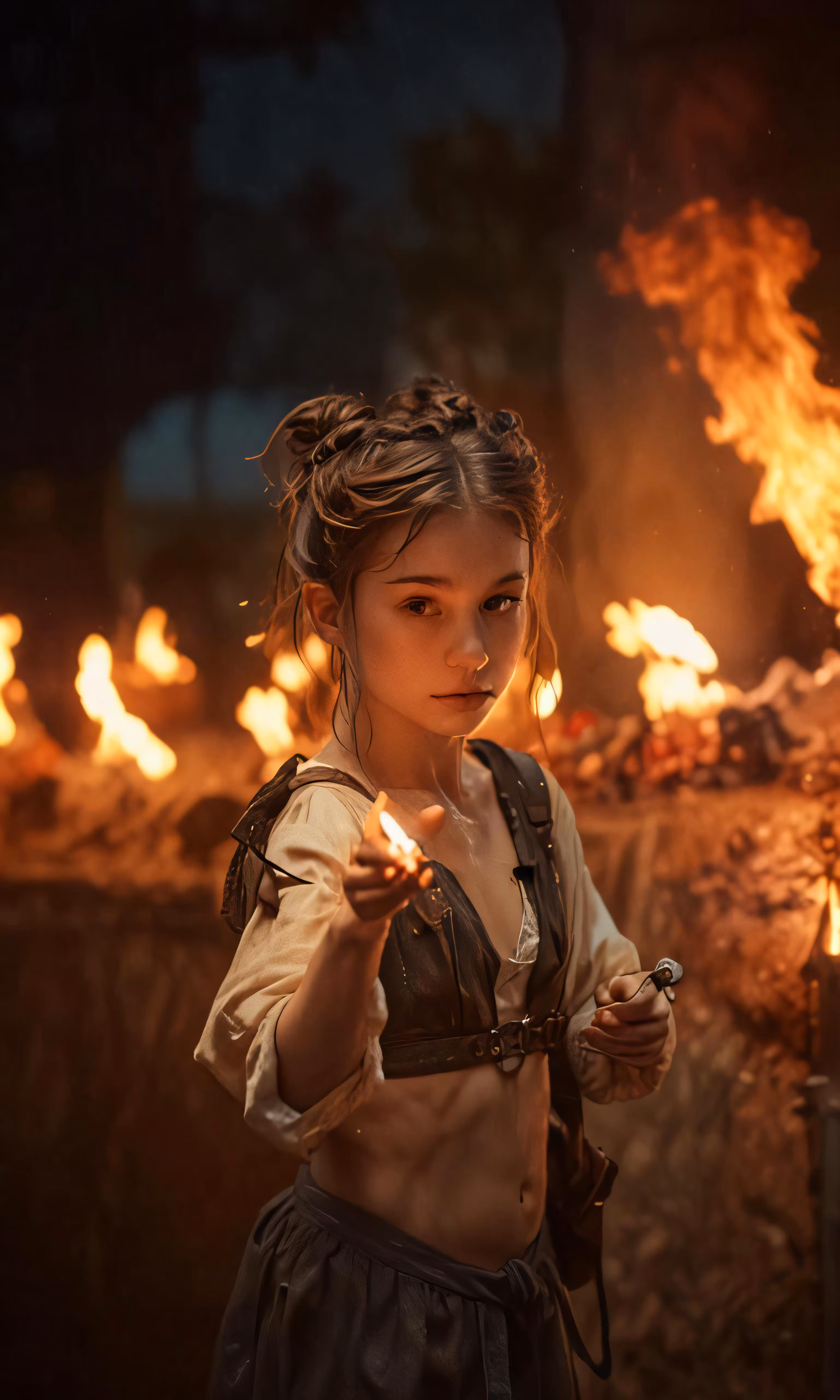 High resolution picture, free to use, the official logo for the 50 /a woman is dressed in costume by a bonfire