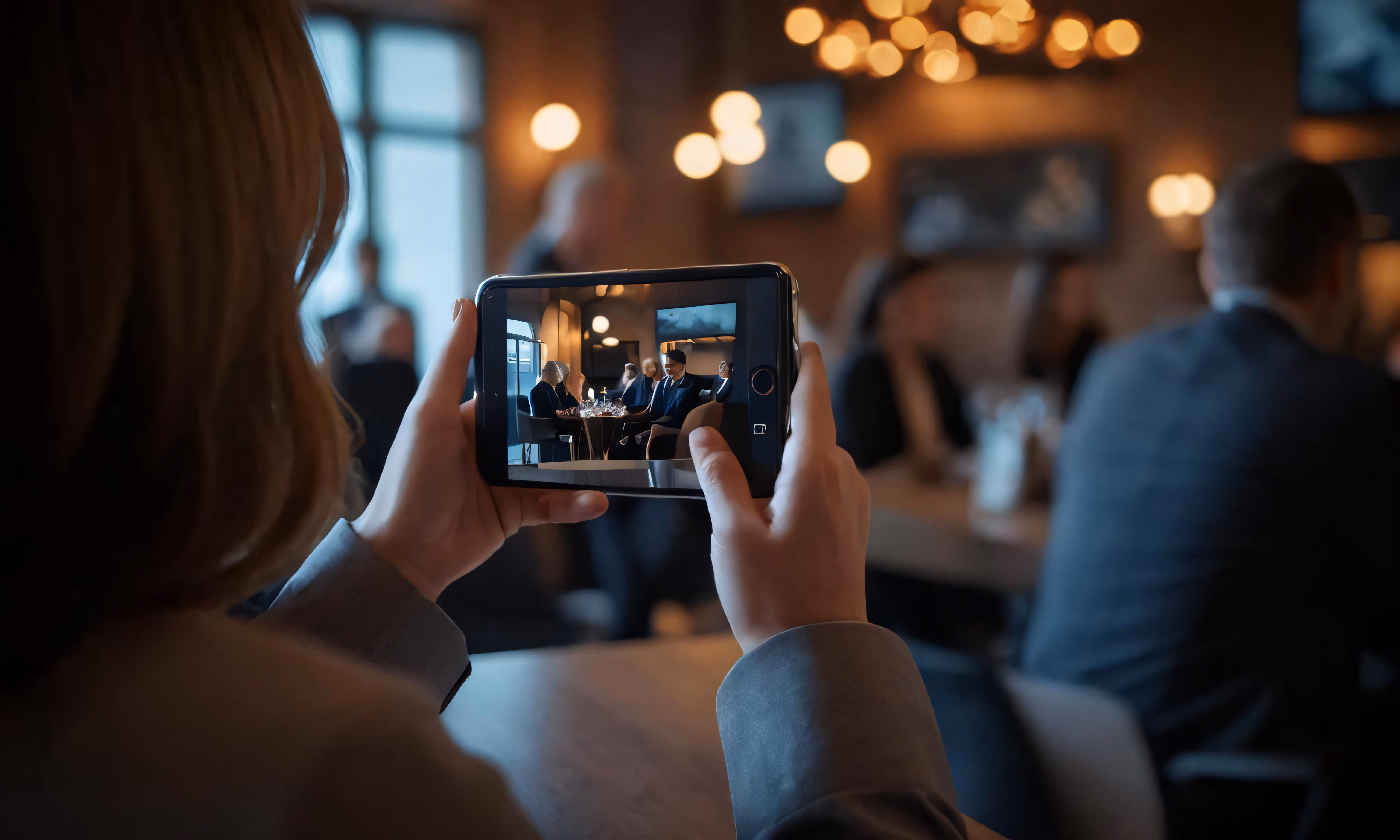 High resolution picture, free to use, the official logo for the 50 /a woman is taking pictures with her phone of a bar